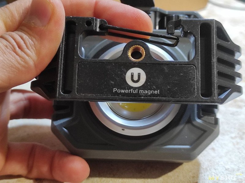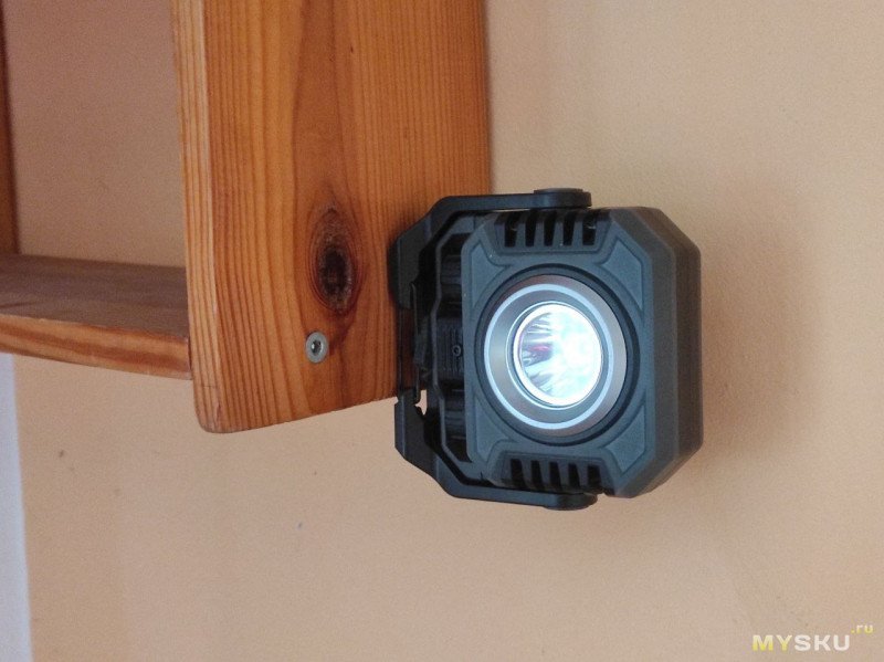 Магнит крепко держит фонарь на металлических поверхностях. Не обязательно это должна быть металлическая пластина, он уверенно висит даже на шляпке конфирмата полки.
