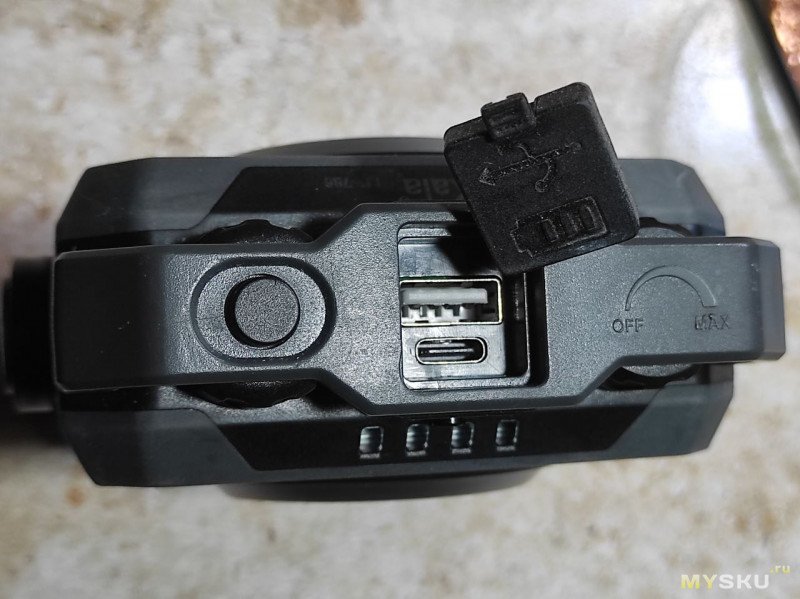 На верхней части две крутилки + кнопка и вход-выход USB, закрытый резиновой заглушкой.