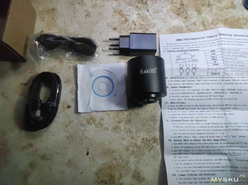 Микроскоп приходит в простой серой коробке, ни бренда ни красивой полиграфии.В комплекте есть простая зарядка, кабель USB A-C, кабель HMDI, инструкция и диск.