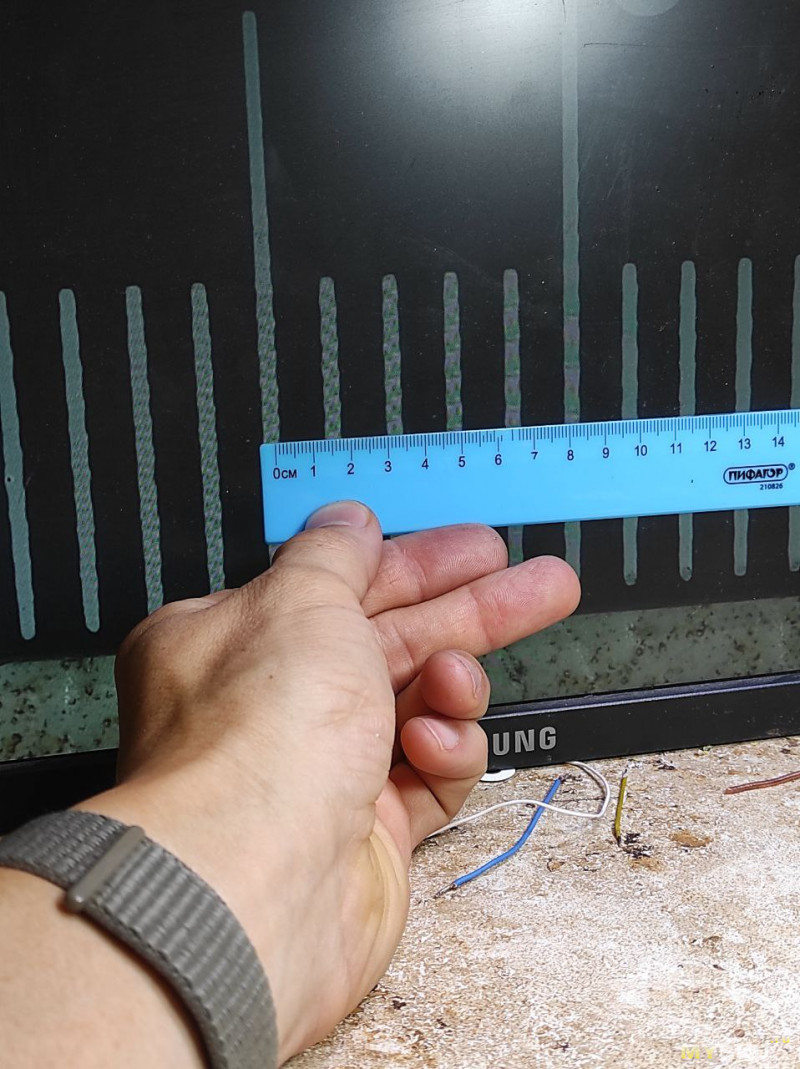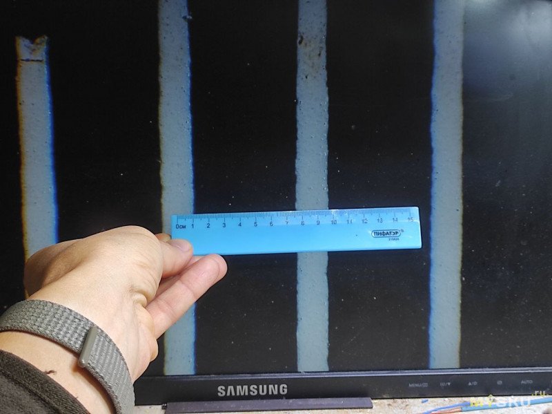 При этом 5мм это 110мм линейки на экране. То есть увеличение составило около 22 при расстоянии 63см от передней линзы.