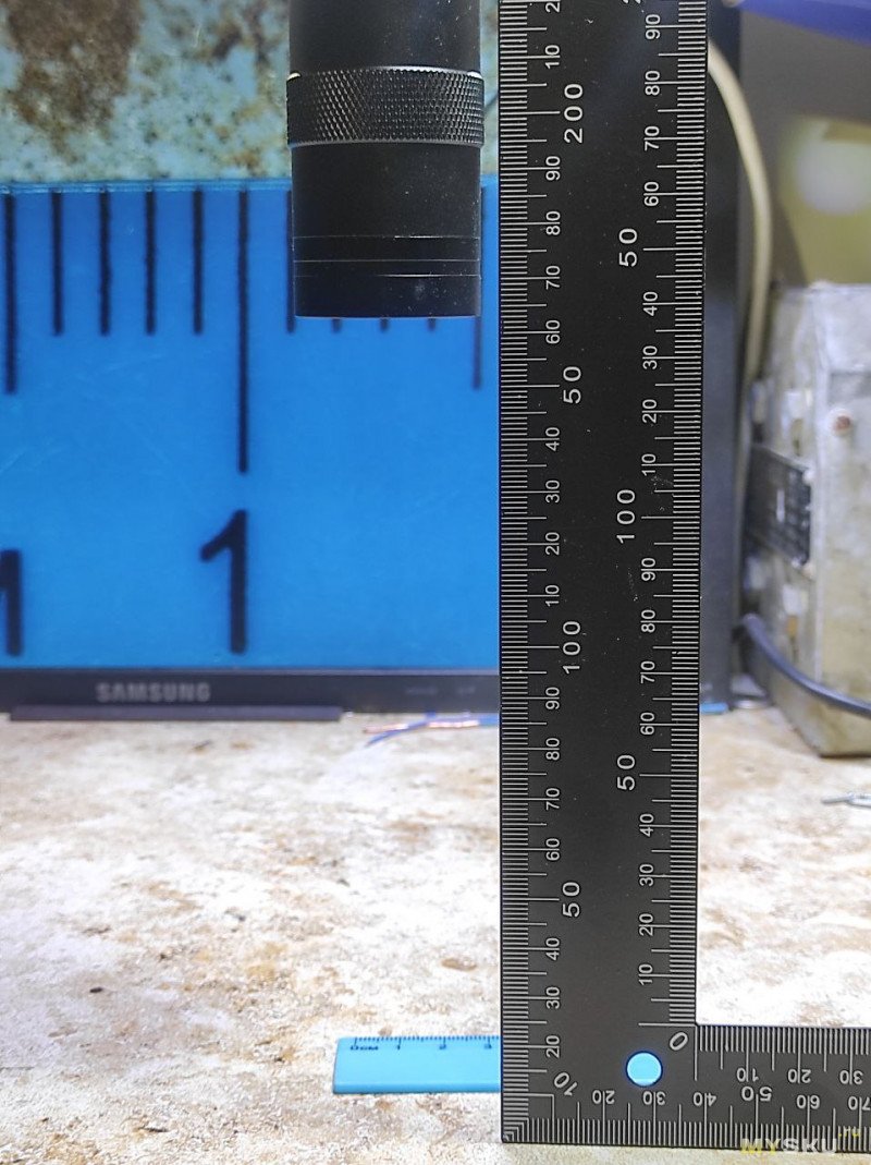 При этом 5мм это 110мм линейки на экране. То есть увеличение составило около 22 при расстоянии 22см от передней линзы.