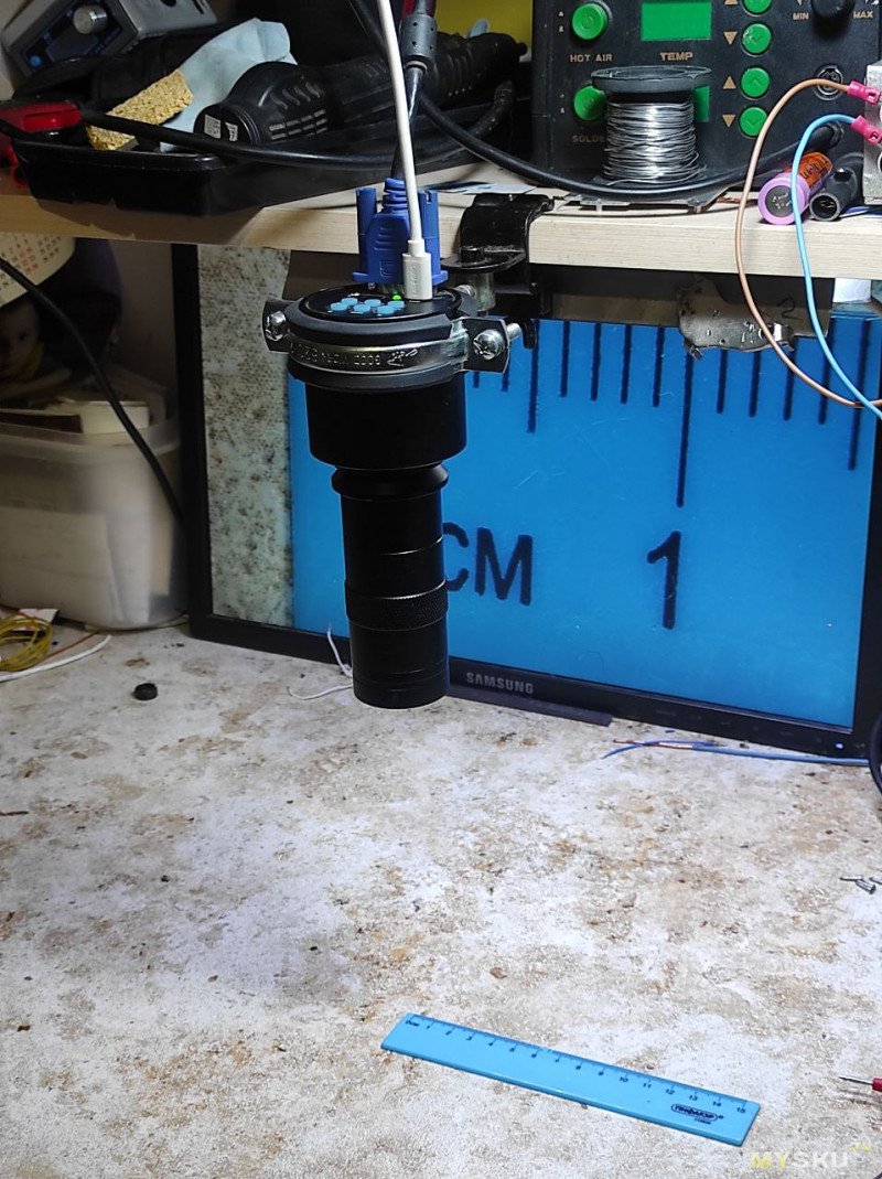 Микроскоп работает с тремя типами выходов — VGA, HDMI, USB, при этом передает картинку по USB — удобно делать фото и записывать видео с него. Задержка по USB большая, по VGA и HDMI задержка минимальна и не ощущается, паять под этим микроскопом удобно. По USB можно использовать планшет с программой USB camera и планшет работает как экран для микроскопа. Я использую монитор 20 дюймов и объектив с названием «Х100» и увеличение получается около 90 раз, с другими объективами и мониторами можно получить большее увеличение. Плохо, что в микроскопе нет цифрового увеличения, иногда его не хватает.