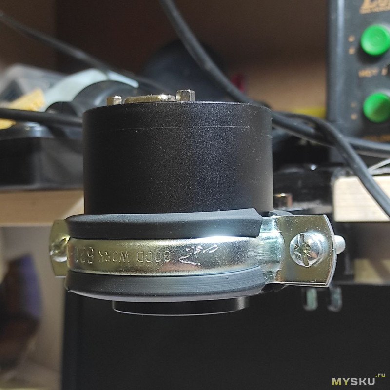Как закрепить микроскоп? У этого продавца Eakins есть другие модели, у многих есть отверстие с фоторезьбой, у этого микроскопа такого крепления нет. Но у него круглая форма, диаметр 60мм. Для крепления идеально подошел трубный хомут под 2 дюйма — хомут для крепления труб к стене. С комплектными резинками он идеально обхватывает корпус микроскопа.