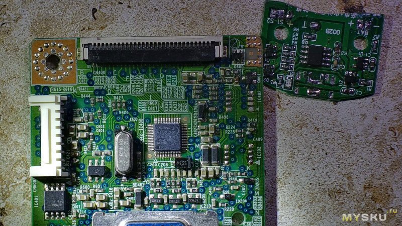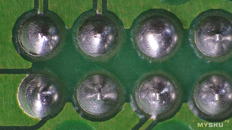 Фото на микроскоп после пайки. Контакты данных просто нормально припаял, контакты плюс и минус восстановил перемычками. Снимал под углом.
