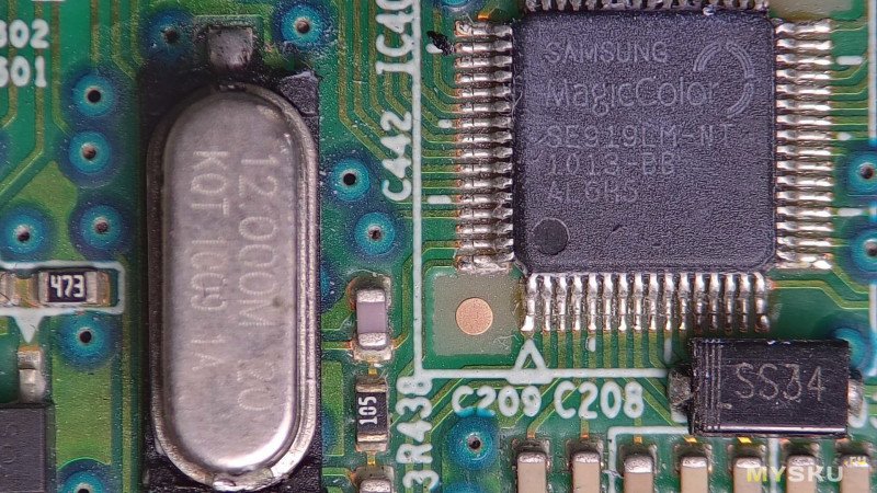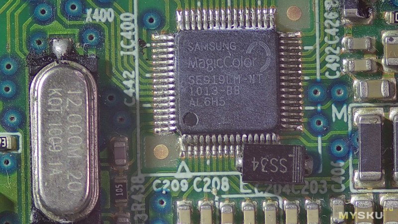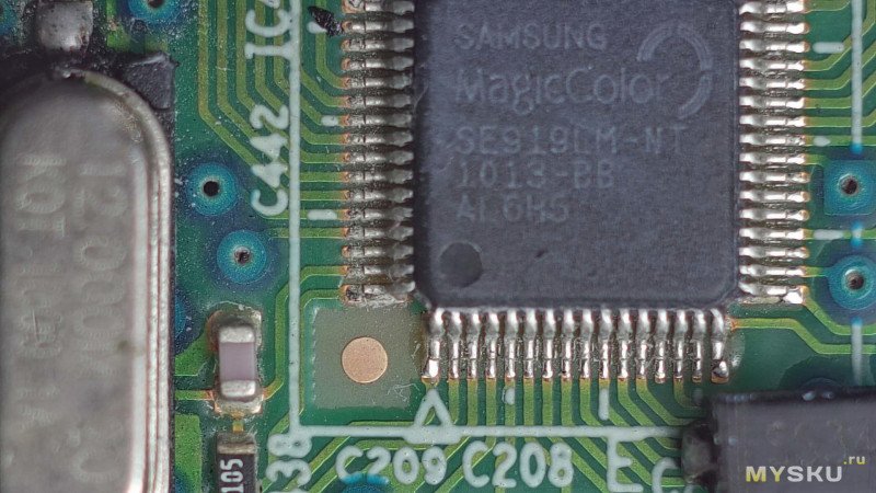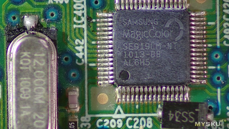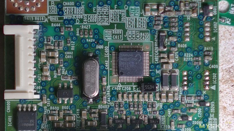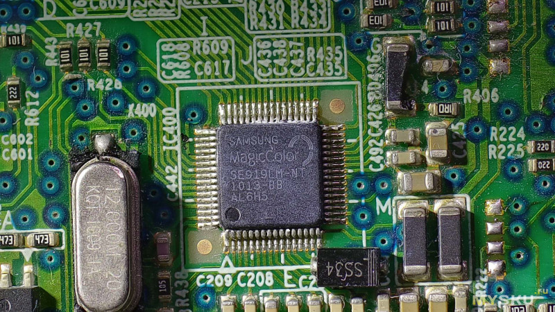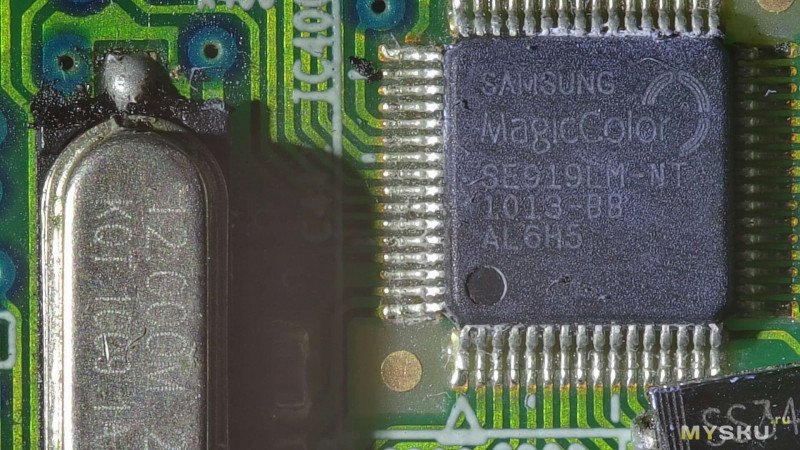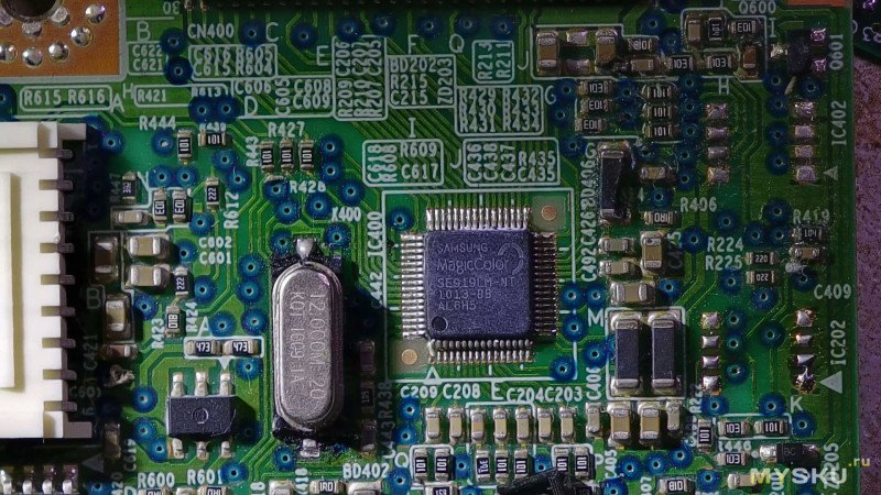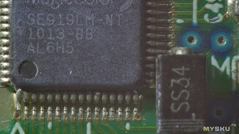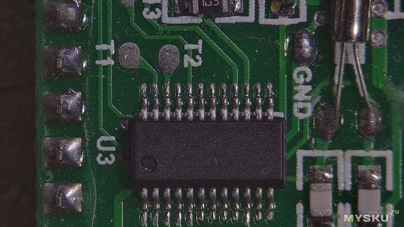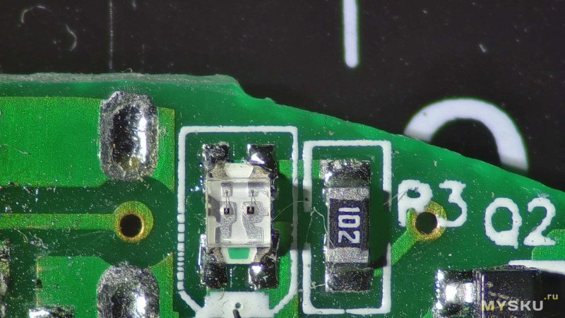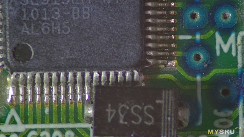 На фото видно, что контакты микросхемы справа уже не в резкости, то есть фокусировка по краям теряется. При этом надпись на микросхеме читается отлично, маркировка диода рядом (он выше микросхемы) читается, маркировка кварца видна не очень. SMD резистор слева тоже слегка не в фокусе. Можно подвигать фокус и тогда в фокусе будут детали по краям кадра, то тогда центр будет не в фокусе.