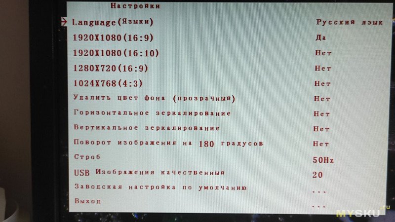 Меню микроскопа появляется на мониторе через VGA или HDMI, через USB не передается. Появляется при нажатии на кнопку Menu, как ни странно. Есть русский язык.Главная страница меню. Кнопками up и down можно выбирать строки меню, стрелка вправо это вход в пункт меню, стрелка влево — выход. Так же нажатие на menu это выход на уровень выше.