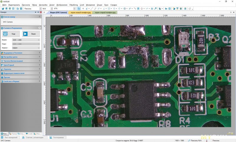 Я установил программу от hayear, подсмотрел в этом обзоре. В ней куча параметров. Можно делать снимки с микроскопа, можно записывать видео. Можно регулировать параметры картинки, поворачивать, зеркалить, можно делать HDR фото из нескольких и очень много другого. Программа с большими возможностями, при этом бесплатная, HAYEAR Industrial Camera Measuring Software Скачать можно здесь: