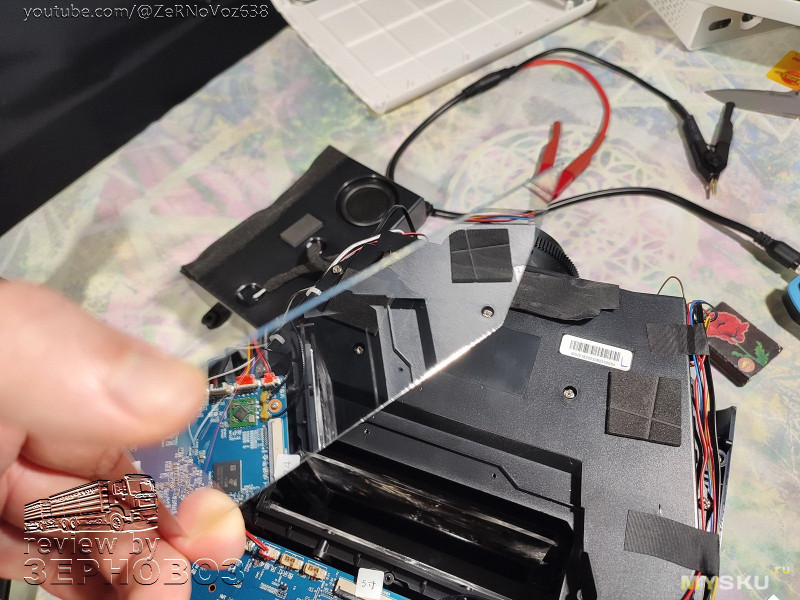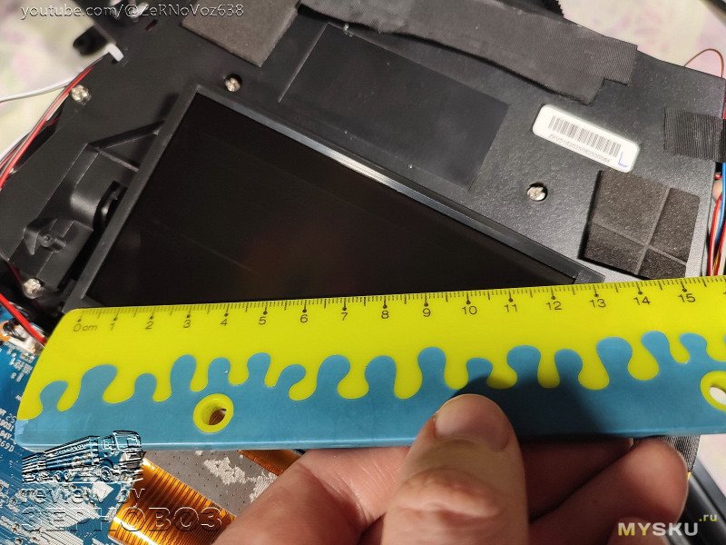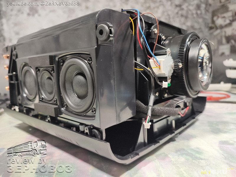 От кабелей — до проекторов. Разбираем и смотрим что внутри. Неонки, кабели, оптика, динамики… хм, их здесь целых три, плюс парочка пассивных излучателей. Измерим диагональ матрицы и посмотрим что по электронике.