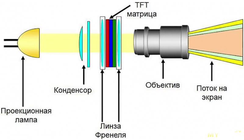 лампа → линза Френеля → жк матрица → линза Френеля → зеркало → линза → экран