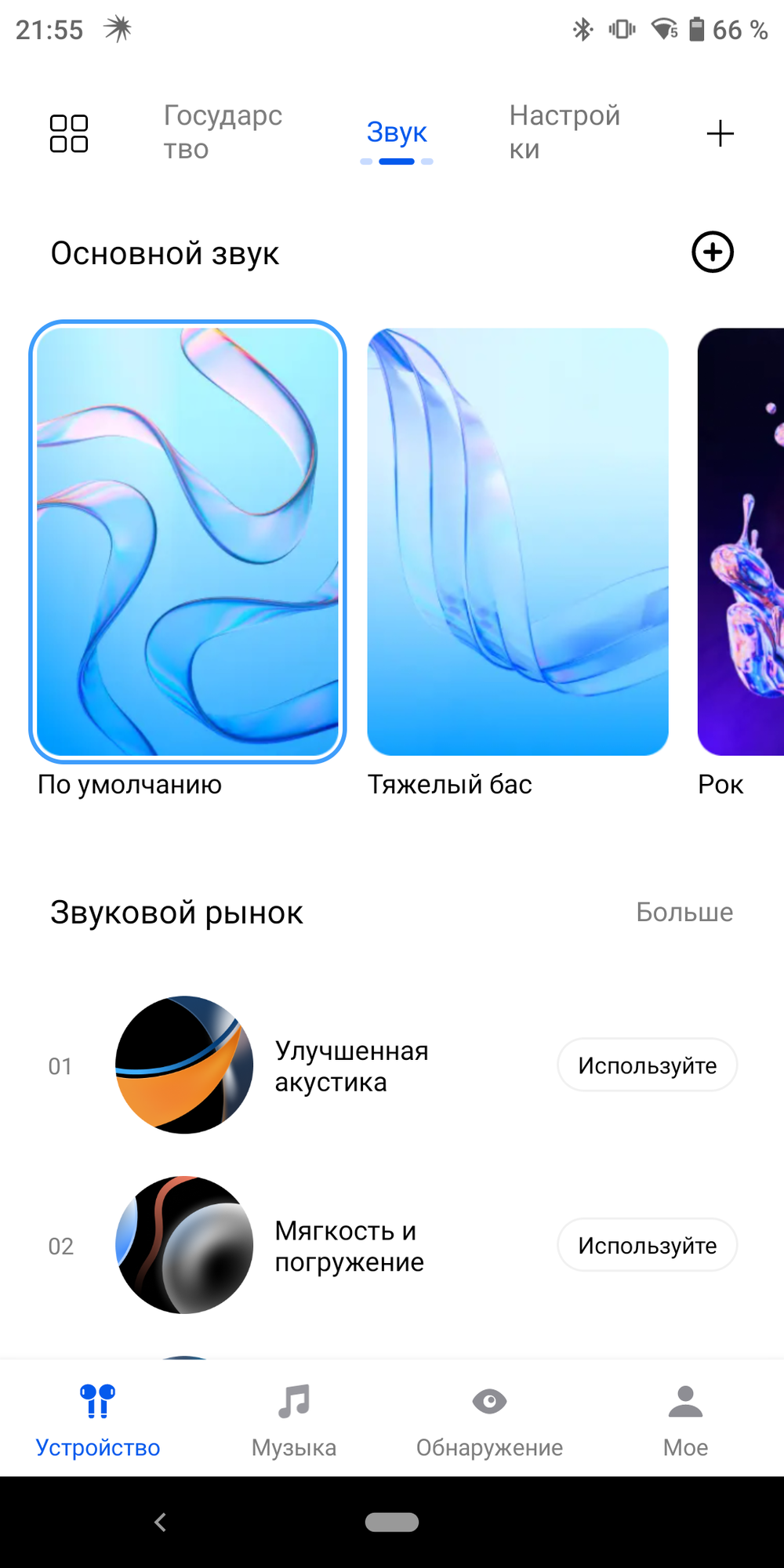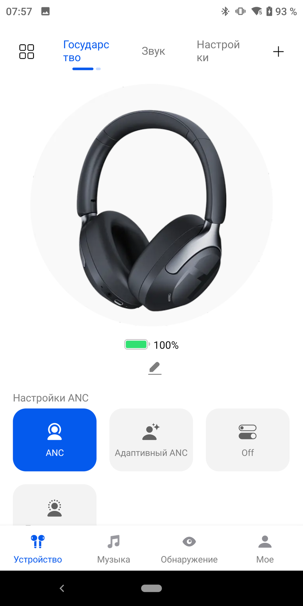 Государство. Пожалуй основной по значимости/функциональности раздел. Здесь можно настроить шумодав, в режиме ANC, можно регулировать силу шумоподавления (доступно 3 ступени). Адаптивный ANC соответственно забирает возможность регулировки руками, Off понятное дело отключает шумоподавление. Режим прозрачности, наоборот, транслирует окружающие звуки с помощью микрофонов ANC, чтобы вам не было необходимости их снимать – ситуативная, но, думается, некоторым весьма полезная фича.