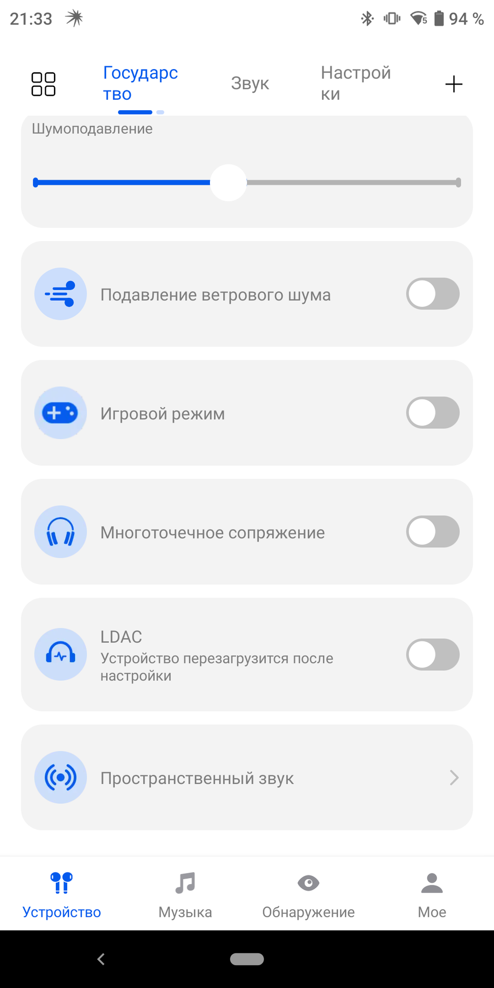 Не все дополнительные функции могут работать одновременно. Например, активация LDAC несовместима не только с пространственным звуком (о чем указанно в инструкции), но и игровым режимом и подключением к двум устройствам.