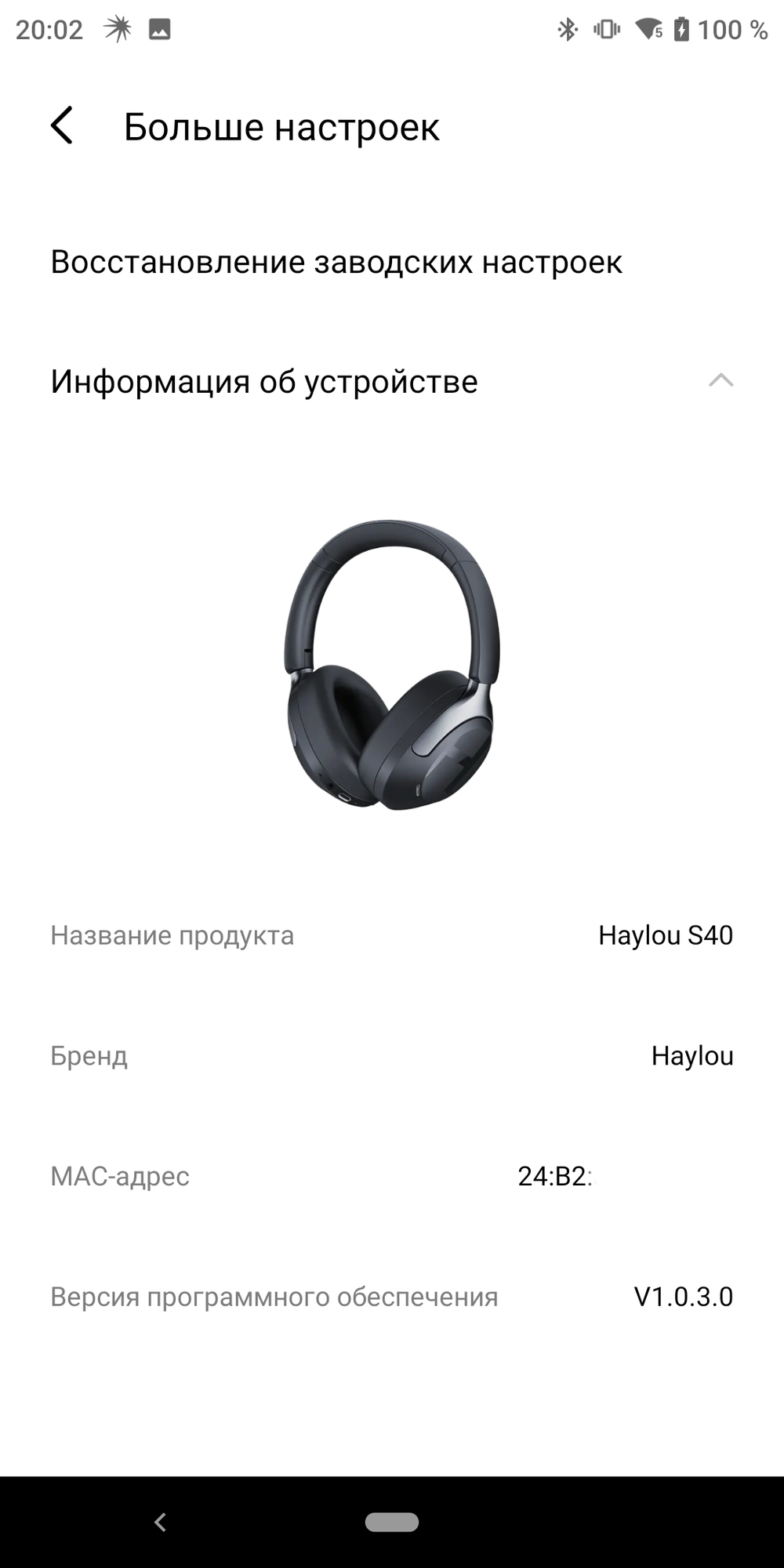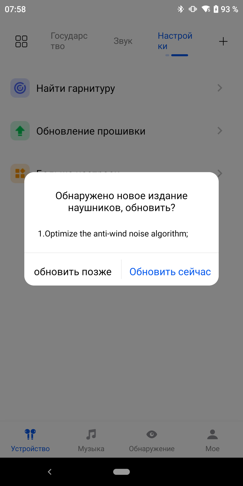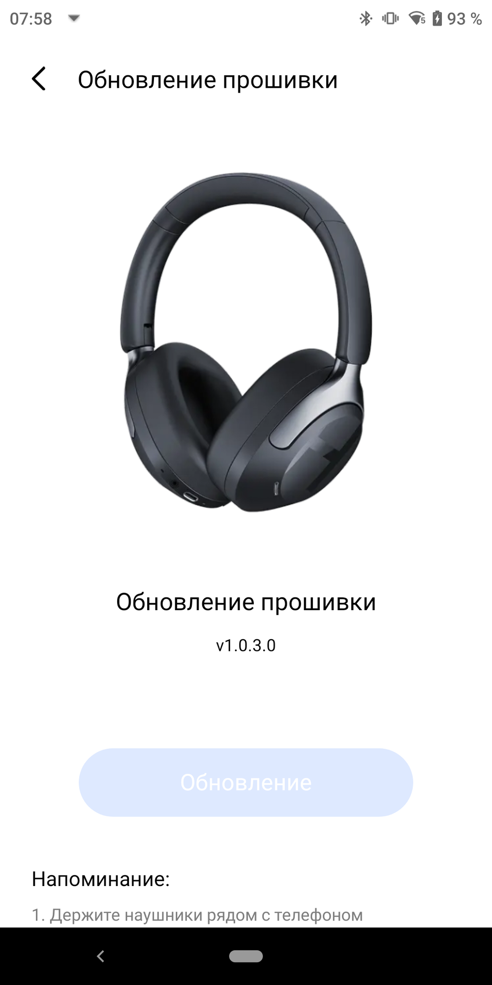 Настройки позволяют найти наушники в комнате, обновить прошивку, сбросить настройки на дефолт и посмотреть некоторую информацию об устройстве. При первом включении приложение определило, что доступна новая версия прошивки и быстро ее обновило.