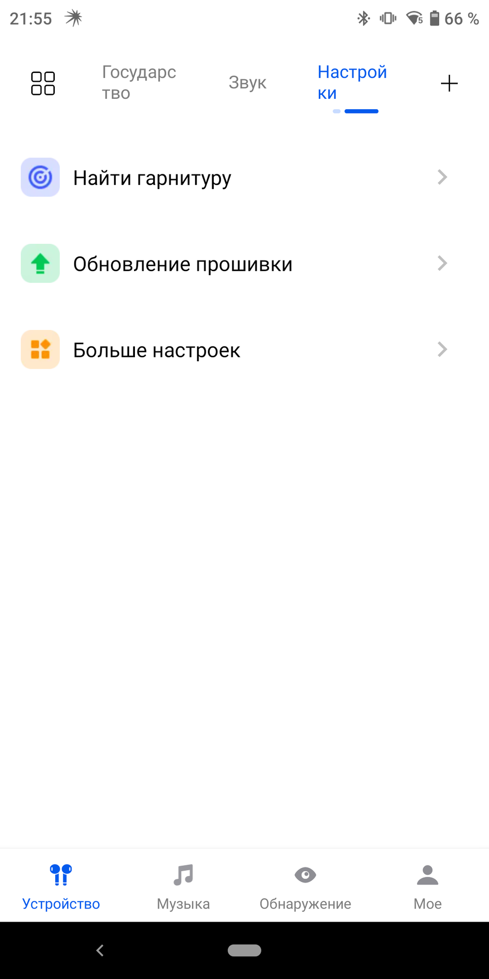 И самый главный раздел – Устройство. Оно разбито на 3 экрана: Государство, Звук и Настройки (как вы уже поняли к локализации есть некоторые вопросы).