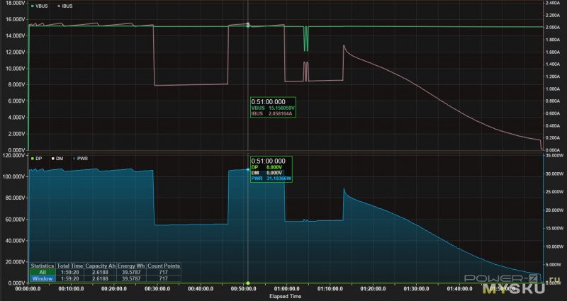 здесь всё просто, стартует в режиме 20В 1.5А и в таком режиме за 50 минут отдаёт около 25Втч, далее напряжение снижается до 12В (1.66А) и в таком режиме ещё 10 минут отдаёт 2.6Втч