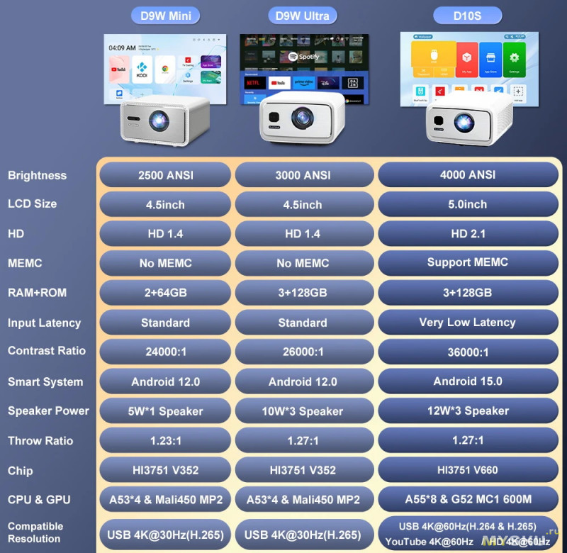 Динамики. Вот здесь разница самая ощутимая. Если использовать проектор без внешних колонок, то все три модели можно «просто смотреть и слушать». Но у модели D9W Mini это будет вполне стандартный чуть деревянный звук из бочечки. Любая блютуз колонка на не-честные 10Вт будет намного круче. А вот у D9W Ultra и D10S звук уже вполне крутой. Особенно у D10S. Можно просто включать и смотреть. И даже кое-где слушать музыку (имеется в виду фоновая, типа тыц-тыц).