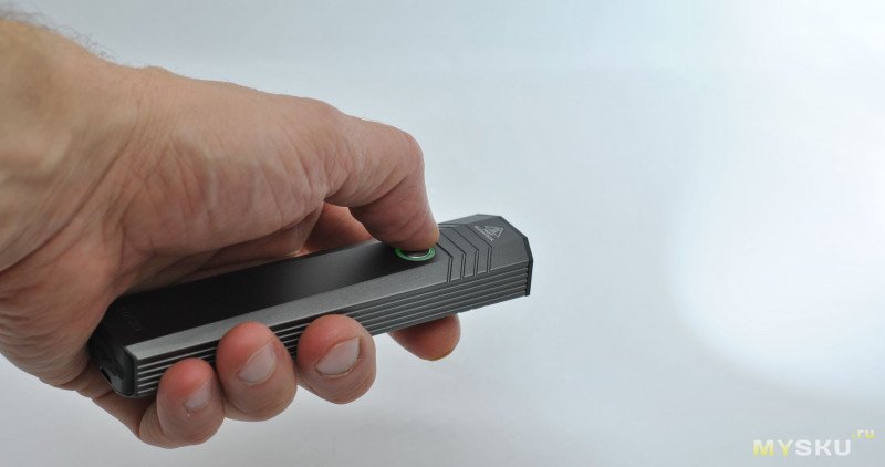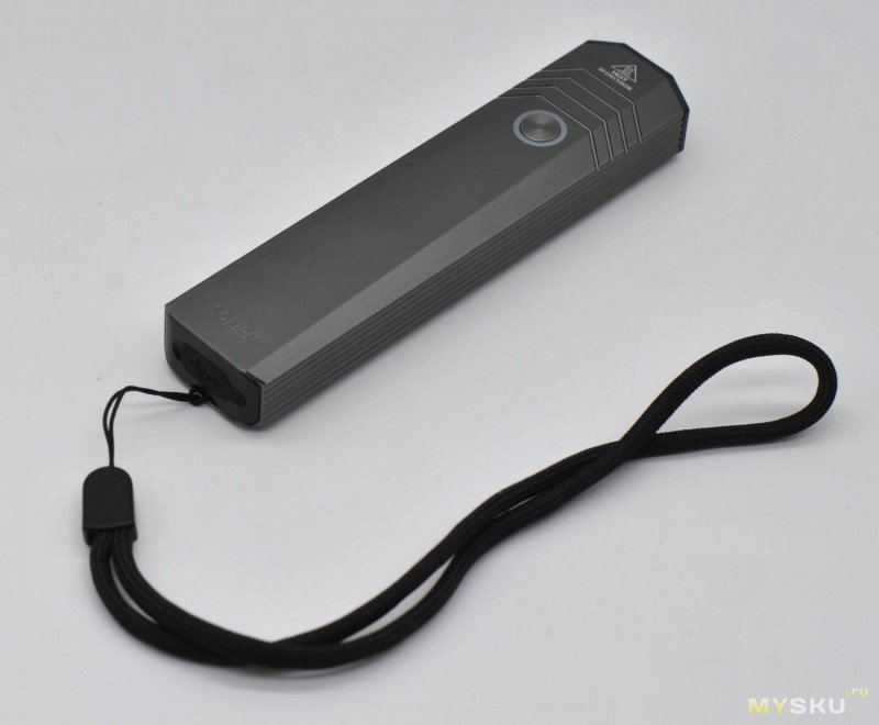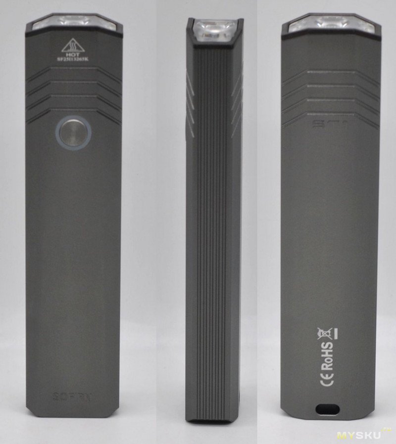 Корпус ST1 из алюминиевого экструдированного профиля с серым анодированием (цвет пока только один). Вытянутый, острых режущих граней нет. Лого и модель выдавлены на корпусе. Кнопка управления одна с кольцевым индикатором заряда.