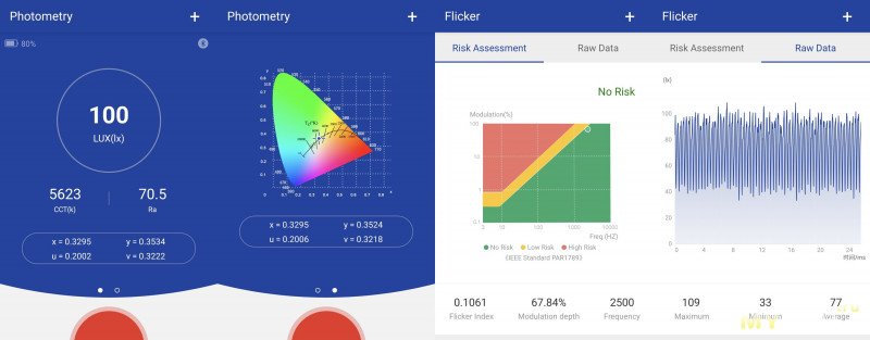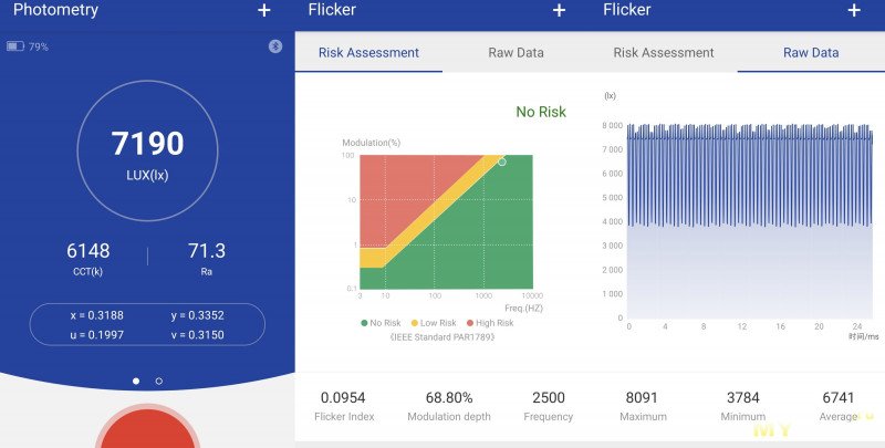 Вредных для глаз величин нет. Цветовая температура получается 5500-6100 K в зависимости от яркости.Заключение