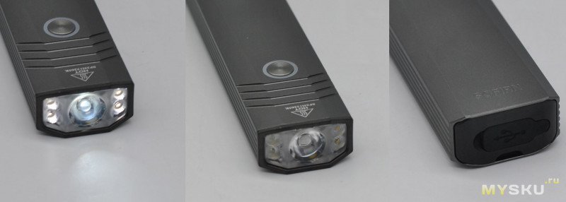Видно, что теплые светодиоды расположены на плоскости повернутой (~10 градусов) от центрального светодиода дальнего света. Все пять работают только вместе. Для расширения зоны освещения вблизи.Задний торец с зарядным портом, закрытым резиновой заглушкой.
