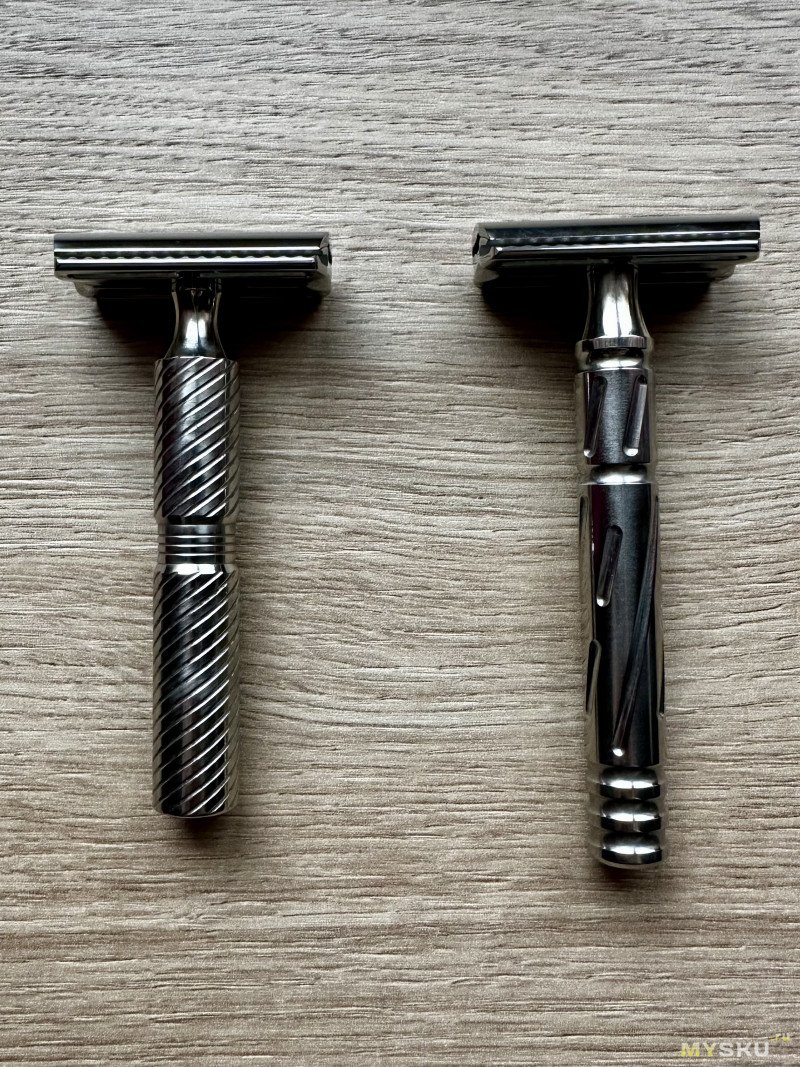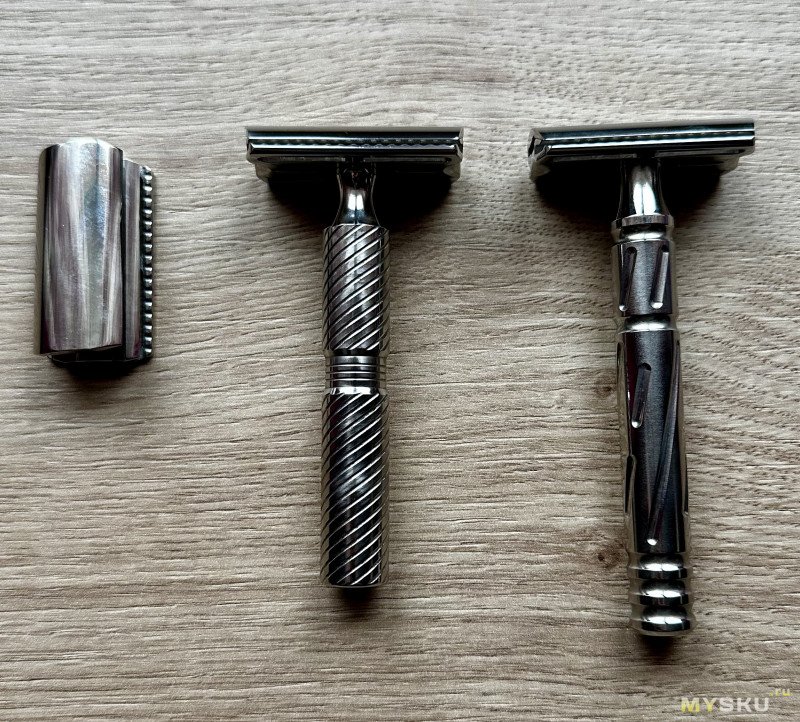 Бритвы отличаются только дизайном ручек и их длинной, головы у них одинаковые.Полировка в зеркало