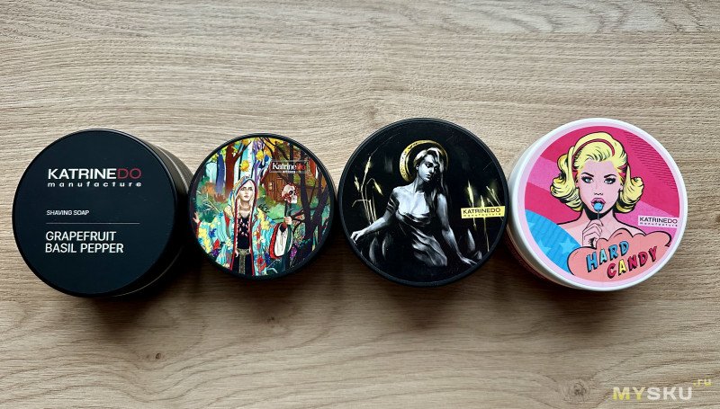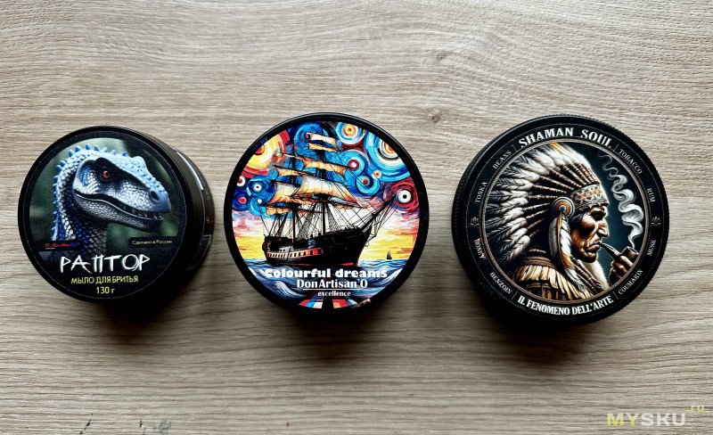 На фото слева направо стандартная база (твёрдое мыло), затем два мыла на базе «Горыныч» — Дар Ягини и Тайна Кикиморы, крайнее справа — мыло на базе «Чародеи».У мыла на стандартной базе защиты мне не хватает. Кожу не стягивает после него, но для агрессивных станков оно мне не подходит.