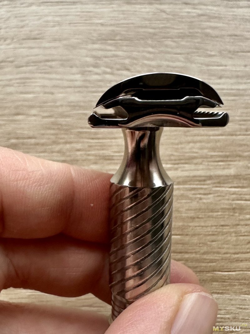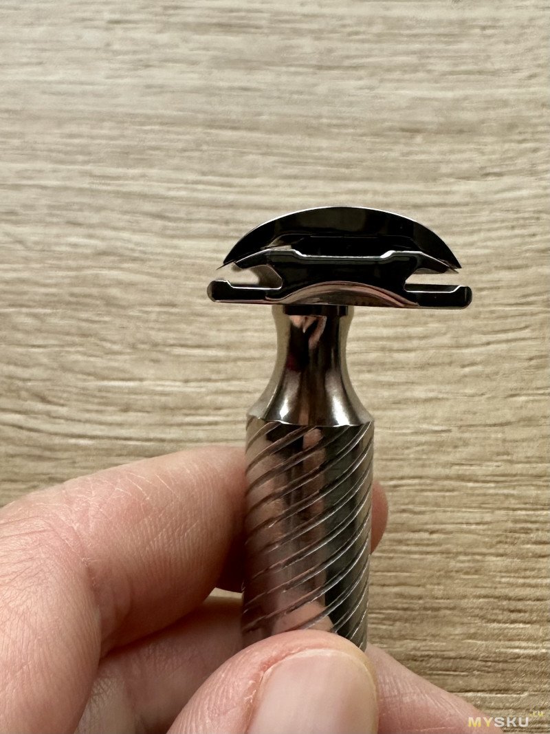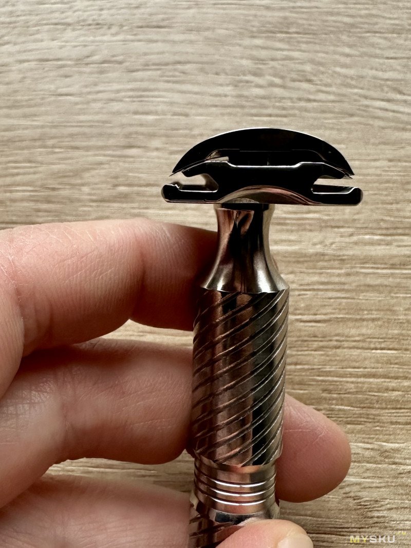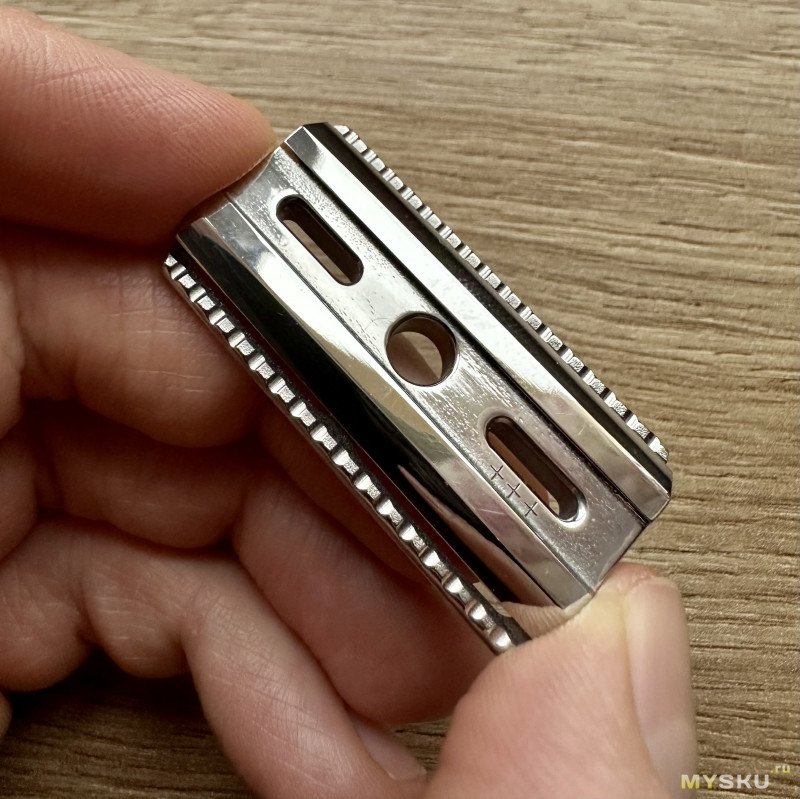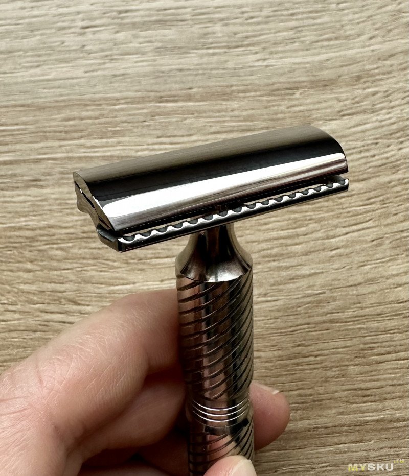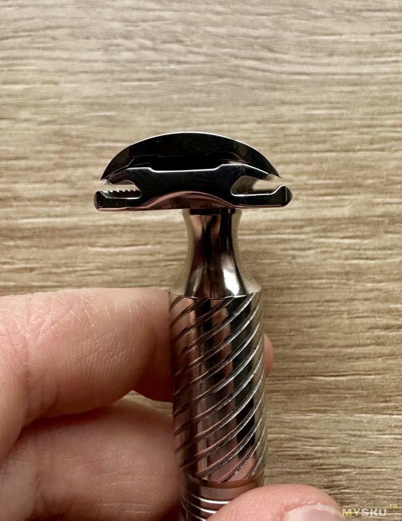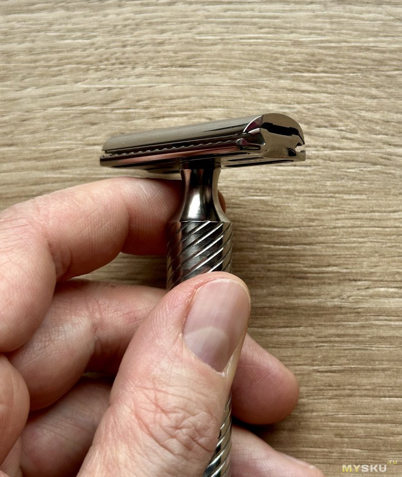 Края верхней и нижней плит закруглены, что исключает возможность поцарапаться. На боковой части головы (в основном на нижней плите) есть углубление, в которое очень удобно ложатся пальцы при сборке и разборке бритвы.