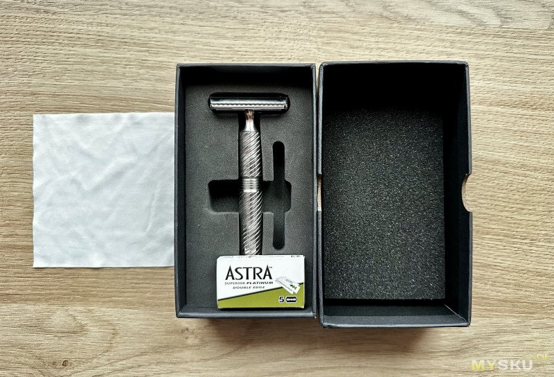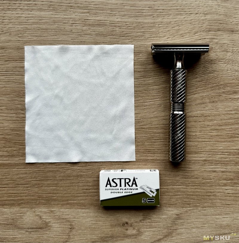 Внутри нас ждёт сам станок, упаковка лезвий Astra и маленькая салфетка.