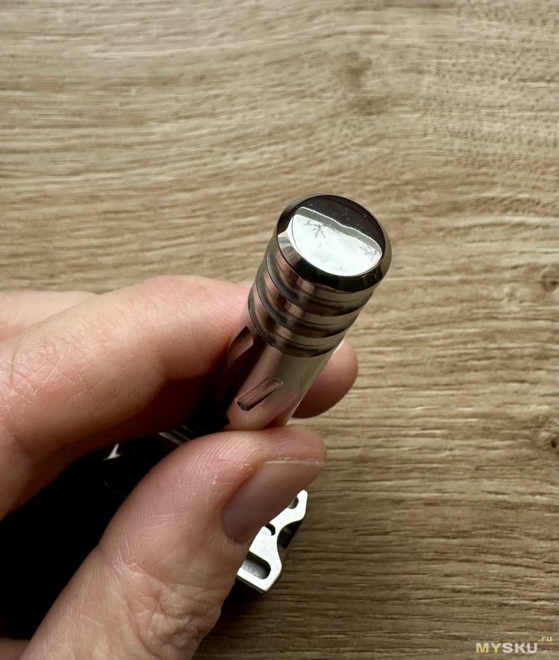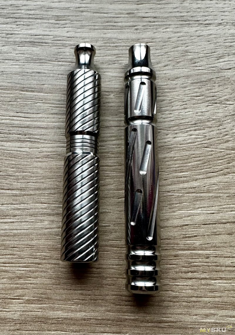 Что же касается ручек, то торцы у обеих ручек также отполированы до зеркального блеска. У спиральной ручки торец плоский, и ручку можно поставить вертикально
