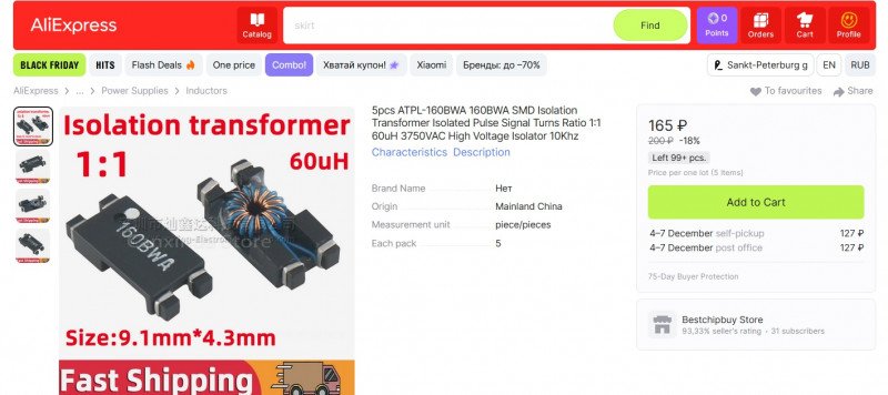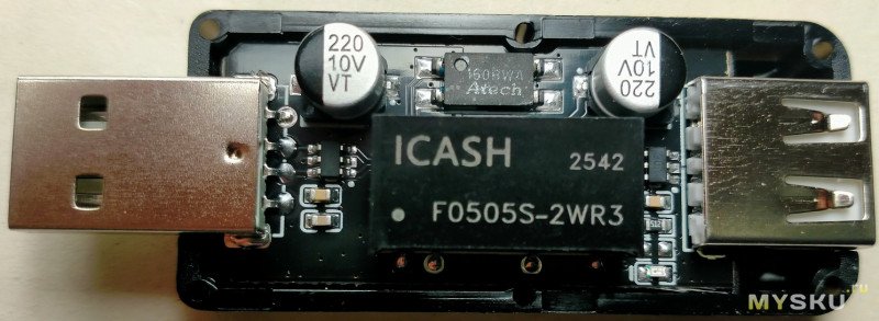 С верхней стороны платы установлены два конденсатора на 220 микрофарад (по линиям 5В, на входе и на выходе), пара шестиногих чипов для защиты usb, изолированный преобразователь 5В/5В 400ма (F0505S-2WR3) и трансформатор 160bwa, который можно найти на алиэкспресс отдельно.