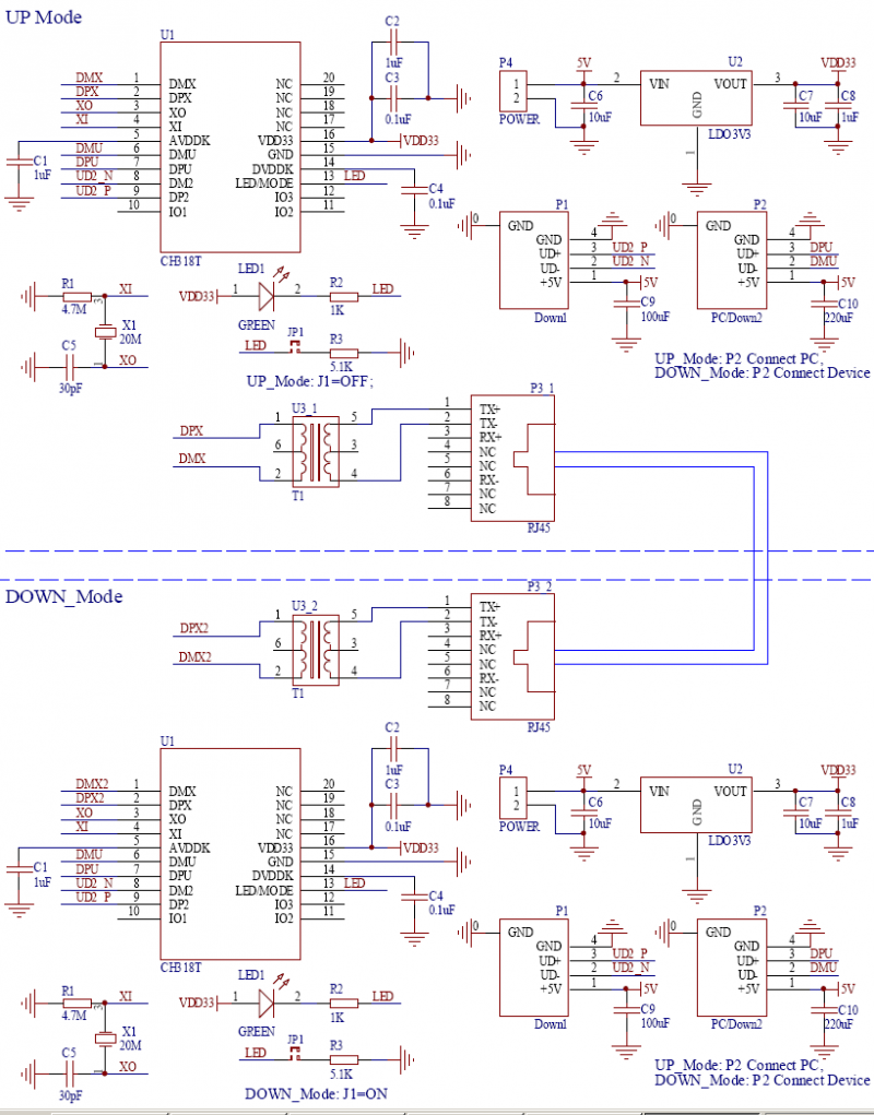 Микросхемы CH318T строго нацелены на выполнение одной единственной функции — развязке и/или удлинению usb. У них всего один управляющий вывод, который определяет, будет микросхема uplink'ом или downlink'ом. К этому же выводу может быть подключен светодиод. Еще есть два вывода для кварца, два вывода для линии сопряжения, три линии для низкоскоростного управления и 2 комплекта линий USB. Для uplink'а используется только один USB интерфейс, к downlink'у можно подключить два устройства (как к usb хабу).