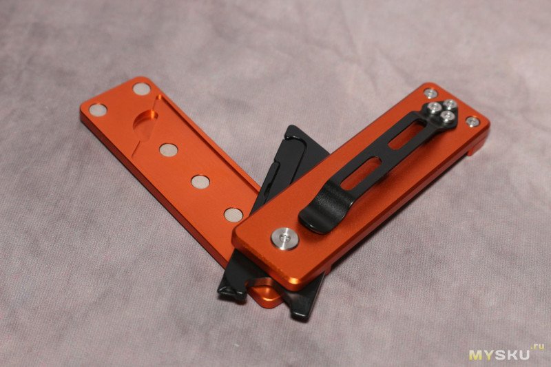С вложенном и разложенном виде рукоять удерживается магнитами. Он не сильно мощные, но самовольно ни сложиться, ни раскрыться нож сам все же не может.