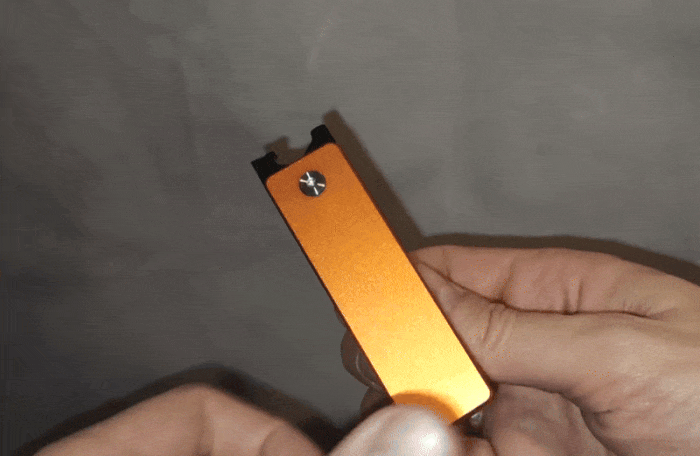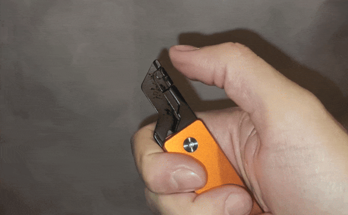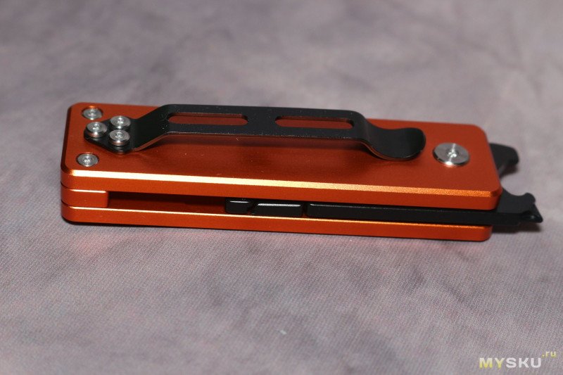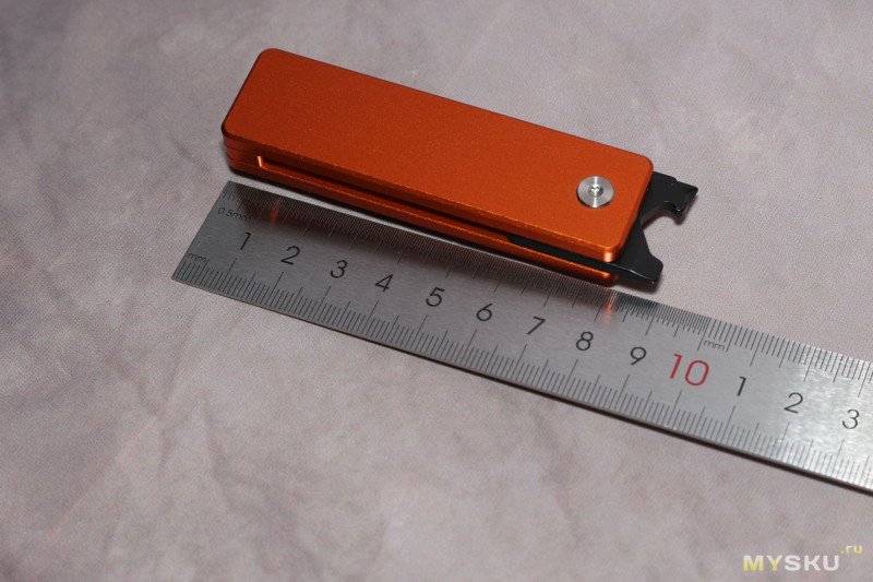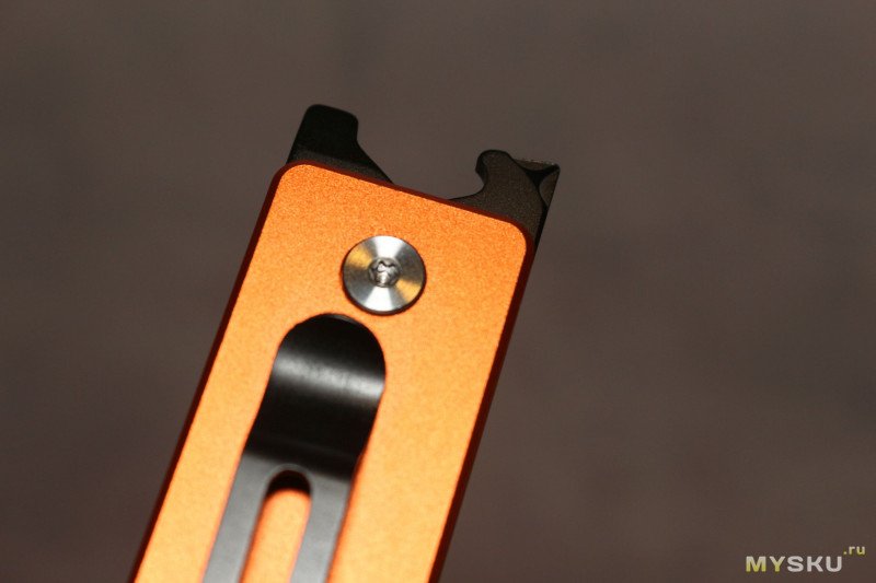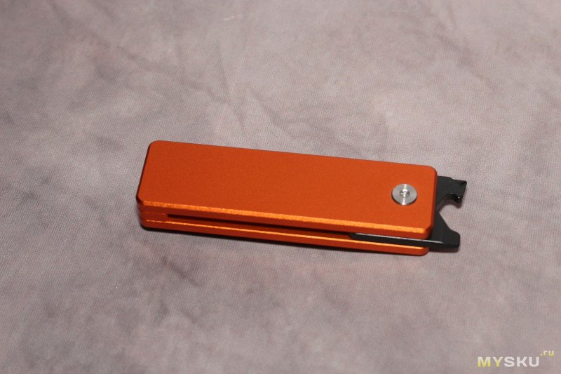 Ножик, что таить, красивый, зараза. Полностью металлический. Рукоять из фрезерованного алюминия, грани скруглены, оранжевое анодирование (также доступны черная и зеленая расцветка, но оранжевая — имхо, самый огонь).