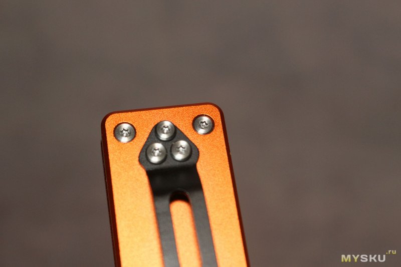 Клипса крепится на трех винтах. Она хоть и довольно толстая и тугая, но нож на кармане удерживает как-то не очень уверенно — при активном движении он может и слететь.