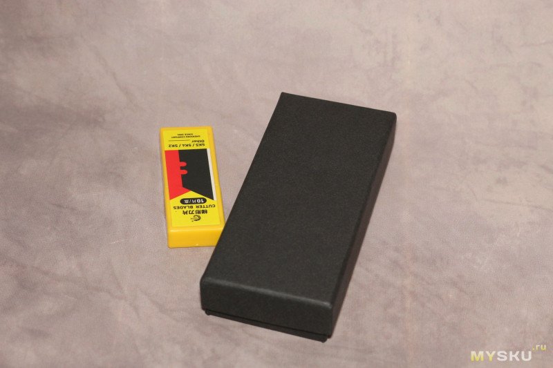 Ножик пришел в пупырчатом пакете. Упакован в коробку из плотного черного картона, радом болтался кейс с пятью лезвиями.