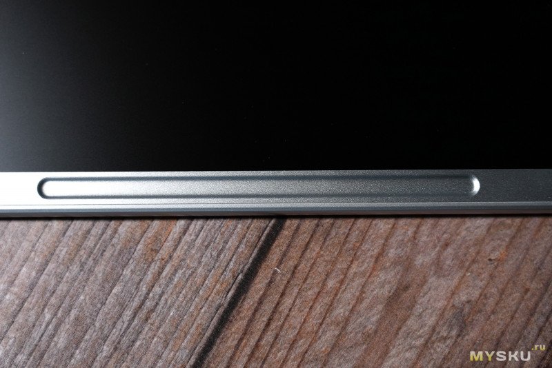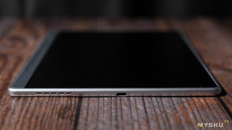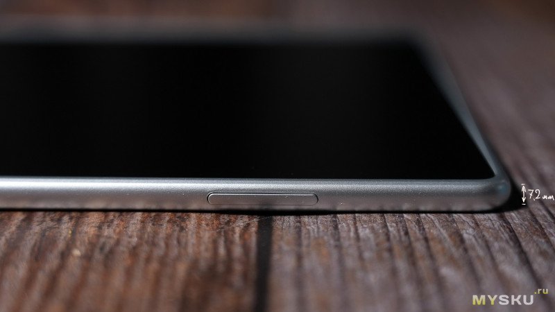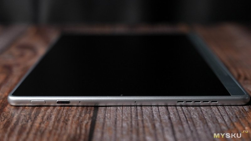 Устройство не сильно тонкое, впрочем сама сборка планшета отличная и на скручивания корпус не поддаётся, жёсткость конструкции здесь приличная. На длинной стороне находится сдвоенная кнопка для регулировки громкости стереодинамиков.