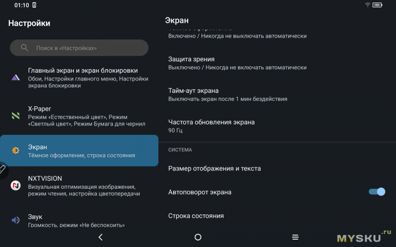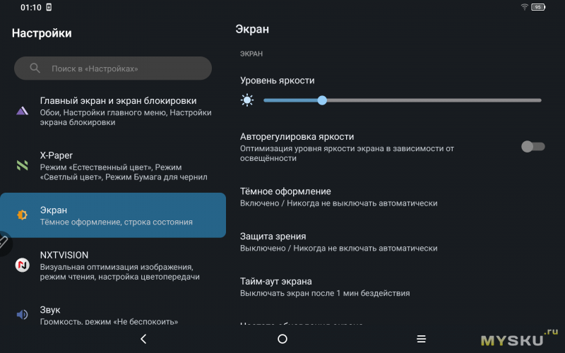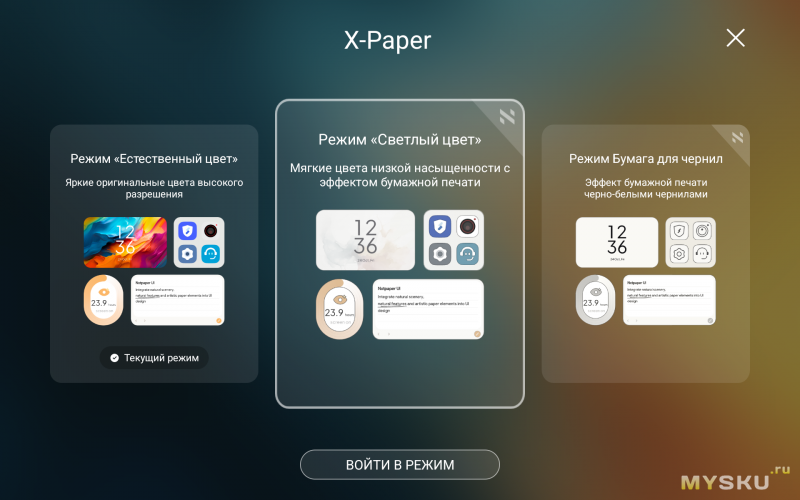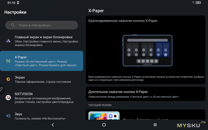 Одна из «фишек» устройства — специальное меню X-Paper, вызываемое через отдельную блестящую клавишу на боковой стороне устройства. Через данное меню можно быстро выбрать цветовую схему для дисплея: