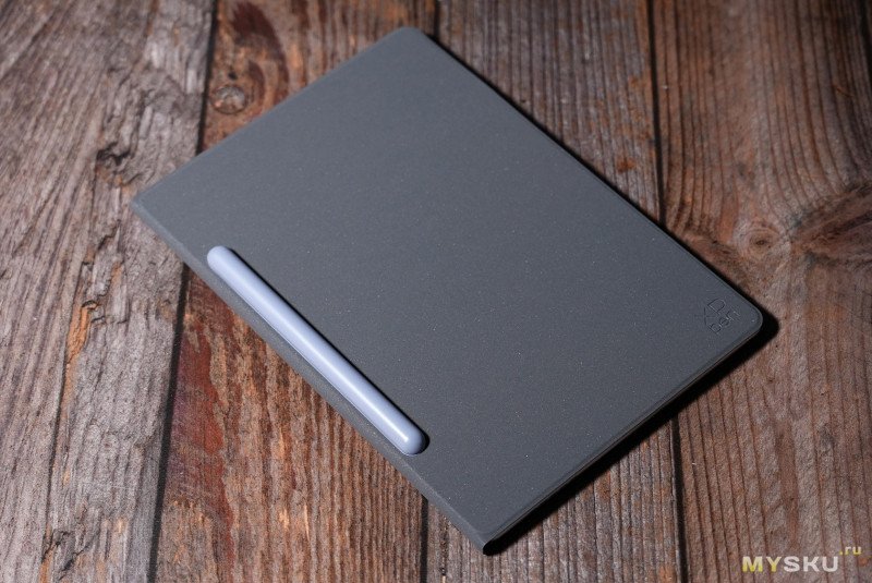 Комплектный чехол-книжка приятен на ощупь, имеет бархатистую поверхность. Планшет в нём держится за счёт магнитов, пазов нет. Чехол выполняет только защитную функцию, использовать его в роли настольной подставки для стола не получится.