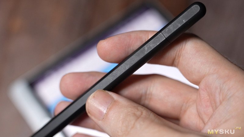 Корпус стилуса сделан из пластика с покрытием типа софт-тач, поверхность сразу собирает отпечатки. Достаточно один раз взять его в руку и останутся заметные следы. Наконечник стилуса не люфтит, как это было в дешёвых моделях планшетов того же бренда.