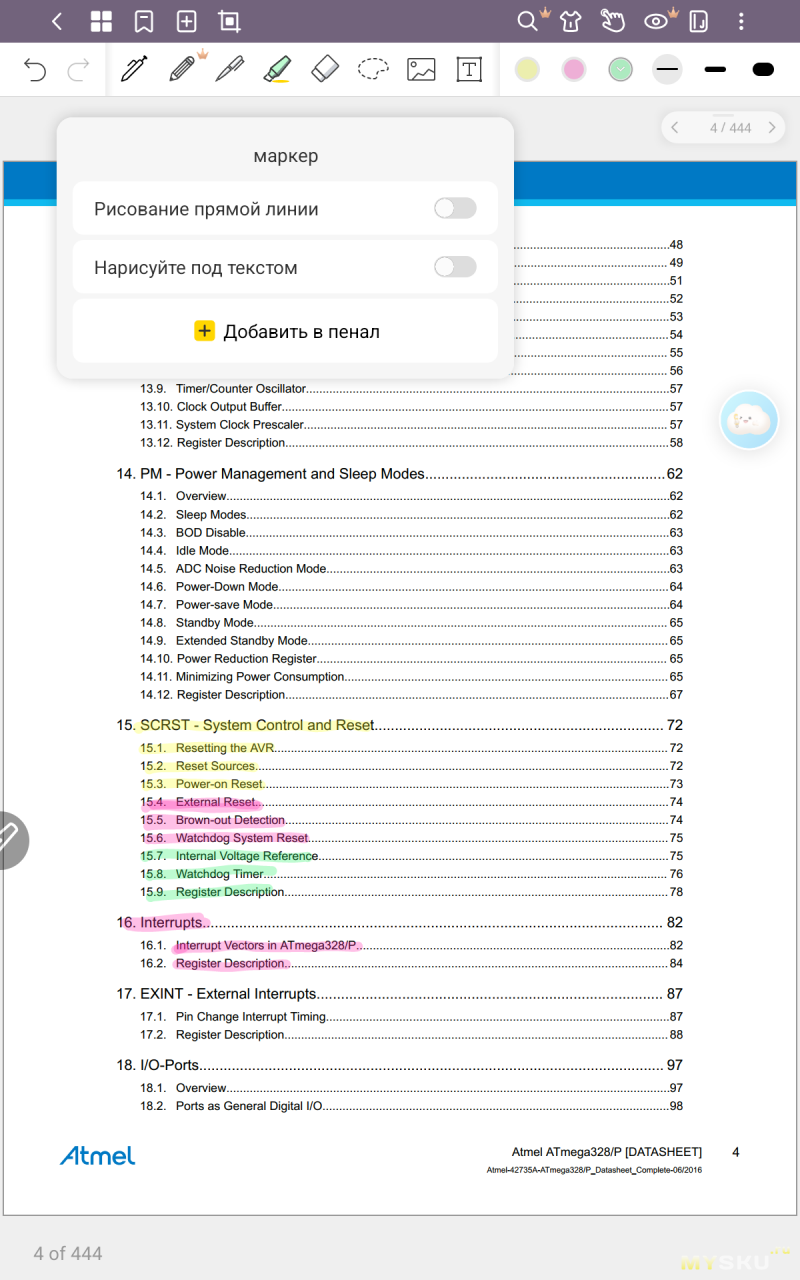Выделение текста. В данном случае я загрузил даташит на микроконтроллер. Выбрал маркер, можно например выделить нужные строки в тексте. Ширина штриха, цвет настраиваются.