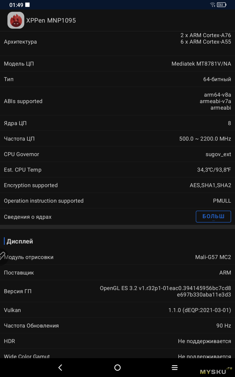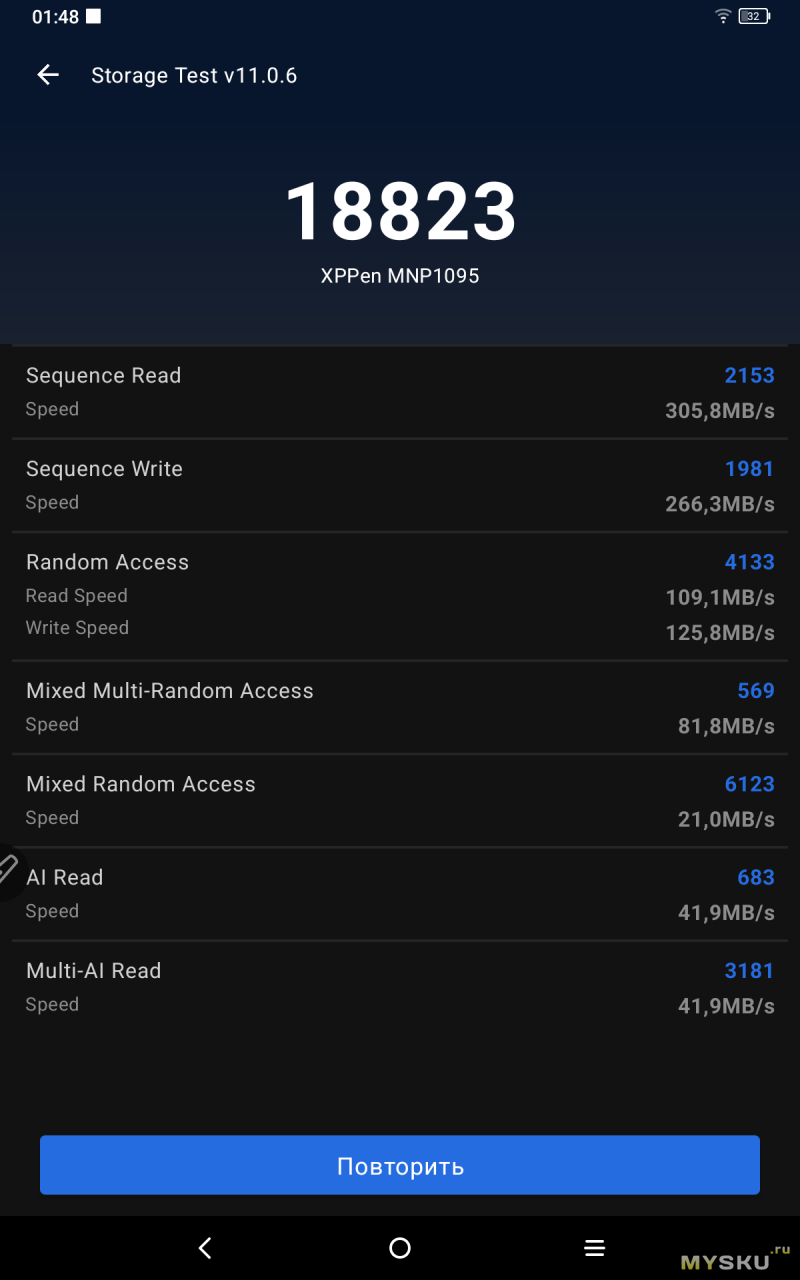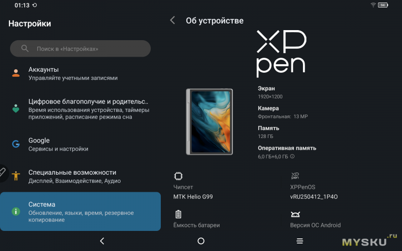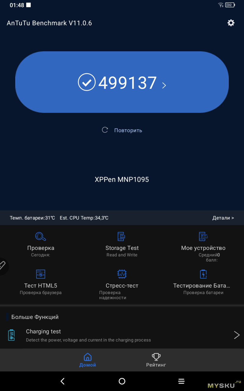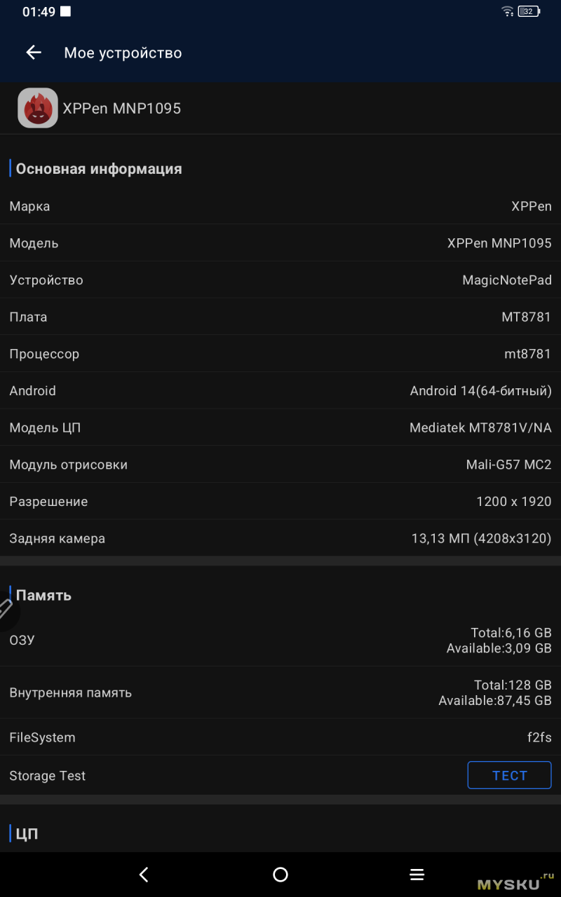 Планшет базируется на 8-ядерном процессоре Helio G99, два ядра из которых работает на частоте 2.2ГГц, а остальные ядра на частоте 2.0ГГц. За графика отвечает Mali-G57 MC2. Для работы доступно 6Гб оперативки + 128Гб постоянной памяти. Характеристики по сегодняшним меркам бюджетные и никакого не удивят. Но посмотрим на результаты тестов в Antutu Benchmark. Рядом приложил скрины с тестами памяти и мультитача, где, однако, поддерживается всего четыре касания.![]() | ![]() | ![]() |