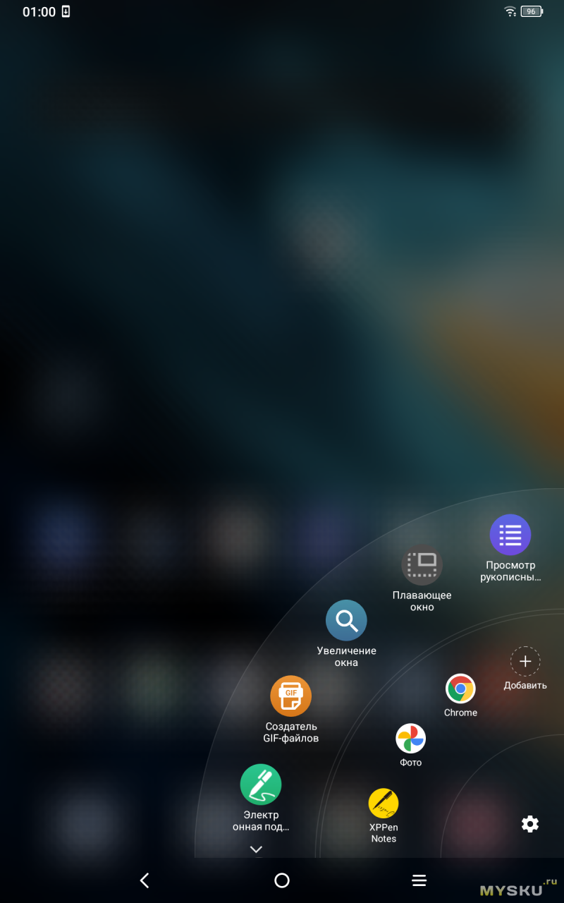 «Плавающая клавиша» — специальная кнопка, которая находится у края экрана поверх интерфейса и приложений. По нажатии на неё открывается карусельное настраиваемое меню с быстрым доступом к избранным приложениям, среди которых создание заметки, запись экрана (или определённого участка), создание GIF-анимации на основе рукописи, и пожалуй основное приложение XPPen Notes, с которым в основном и будем работать, орудуя стилусом.