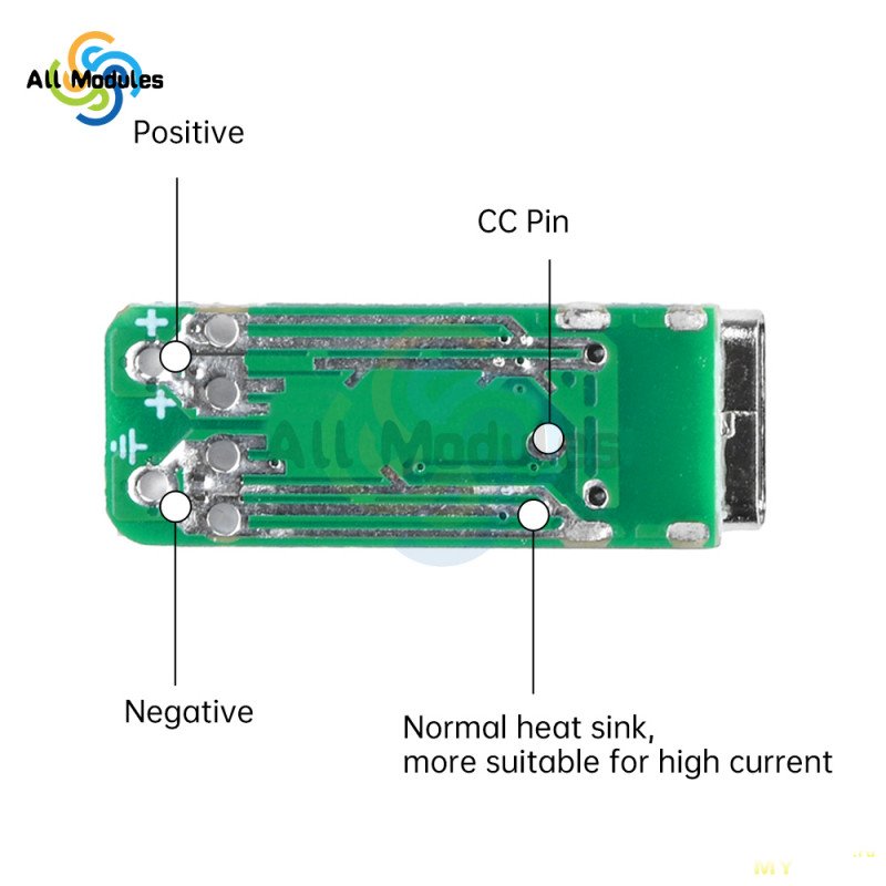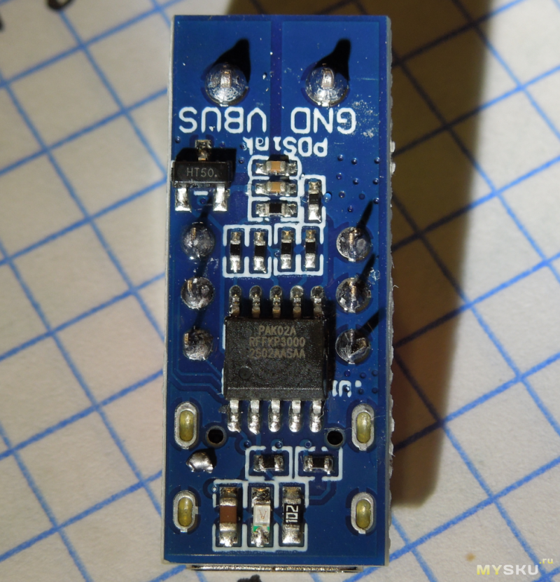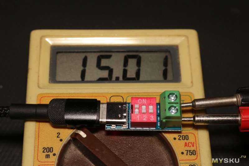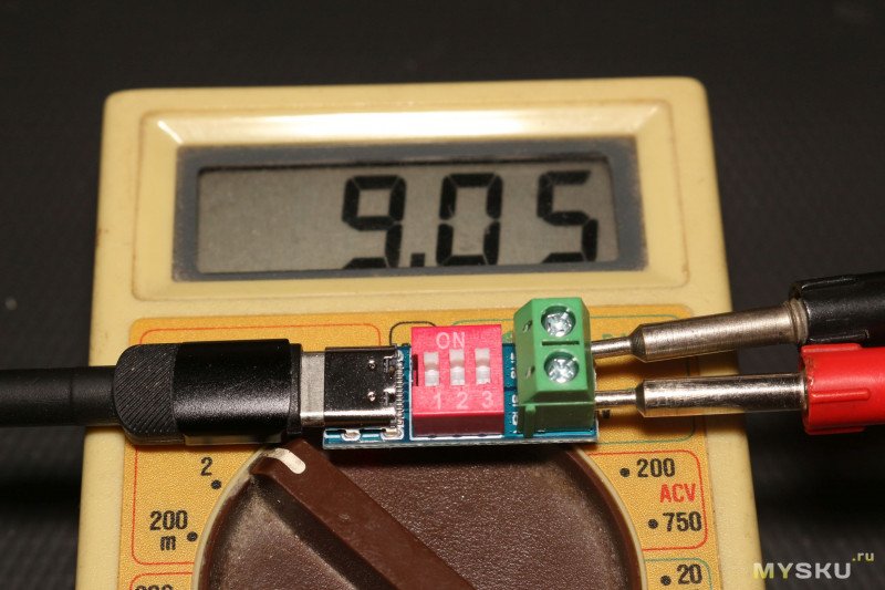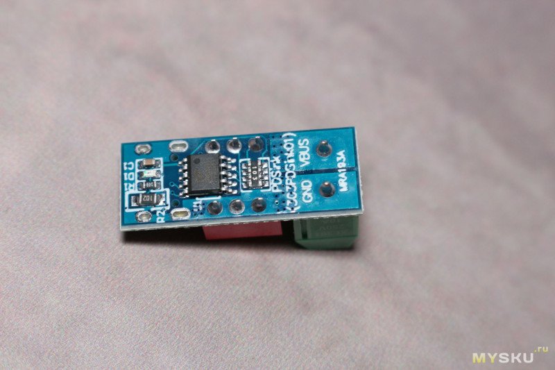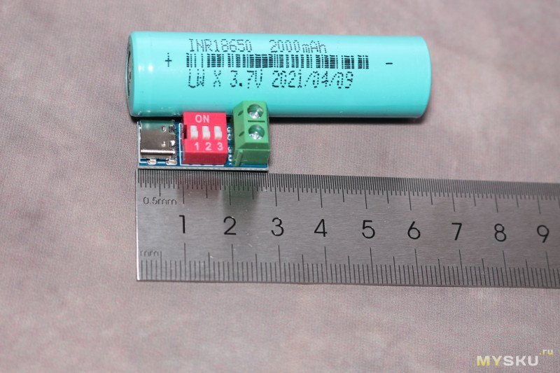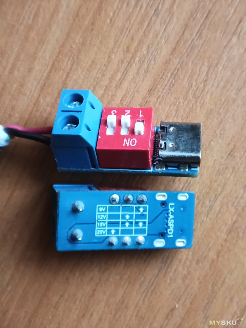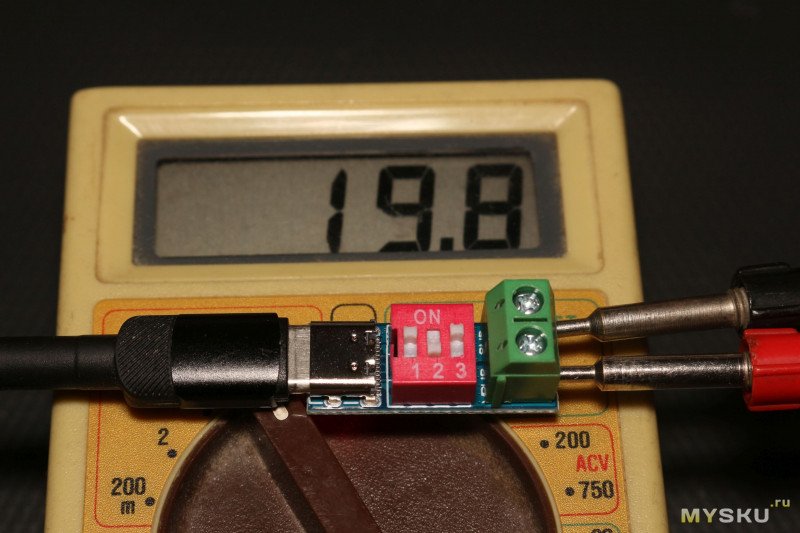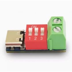 На платке длиной чуть меньше 3 см и шириной 1 см один за другим расположились разъем Type-C мама, переключатель с тремя тумблерами для установки выходного напряжения и контактная колодка с винтовыми зажимами. Максимальная высота устройства в районе колодки — 11,7 мм. Толщина текстолита 1,5 мм.
