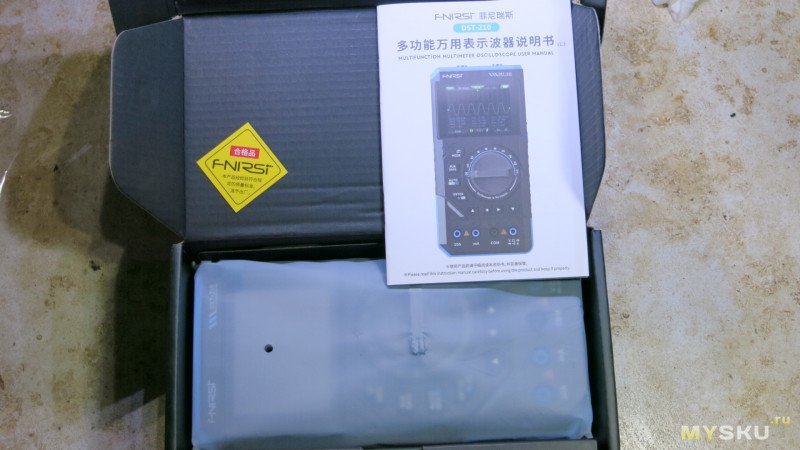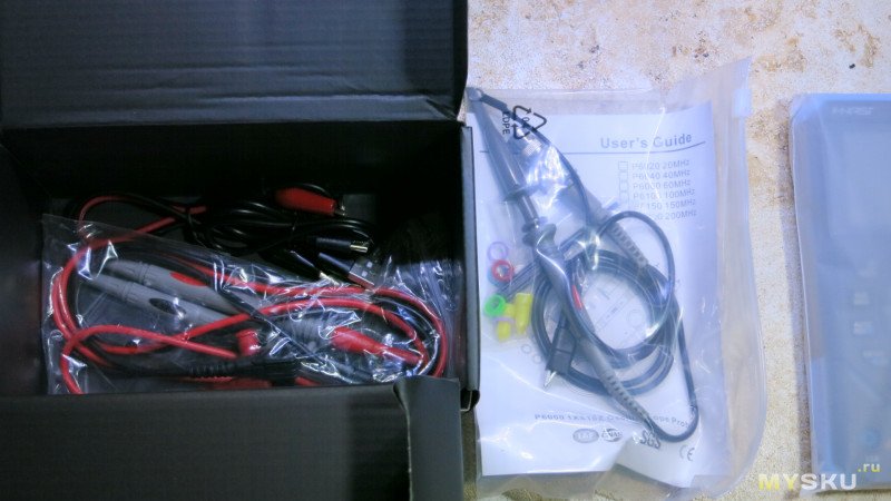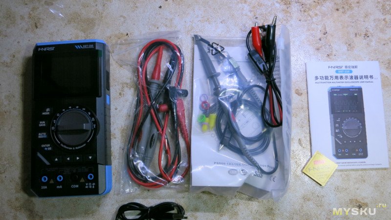 Внутри прибор и инструкция, под ними вторым слоем щупы и провода.