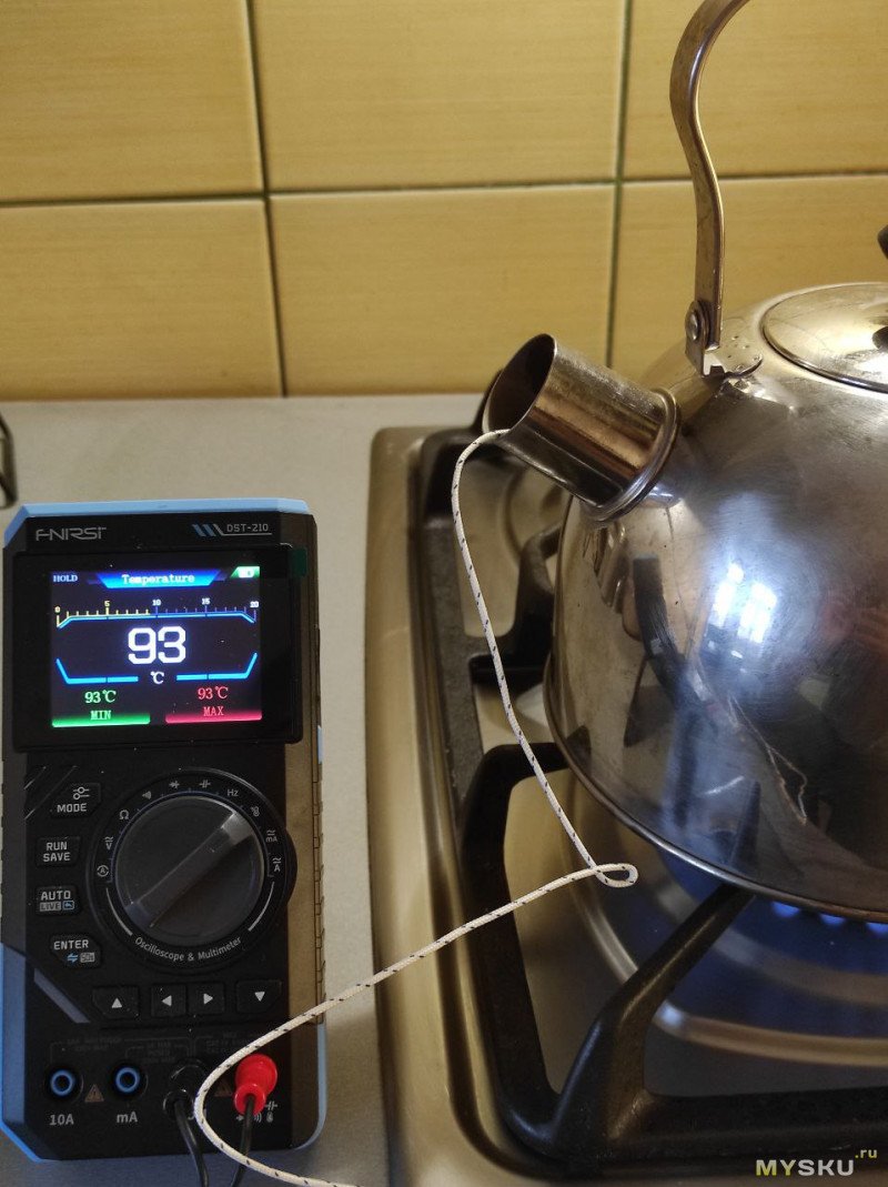 Без термопары показывает температуру внутри мультиметра, с ней показывает температуру термопары. В кипящем чайнике прибор показал 93С.