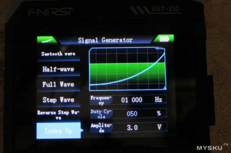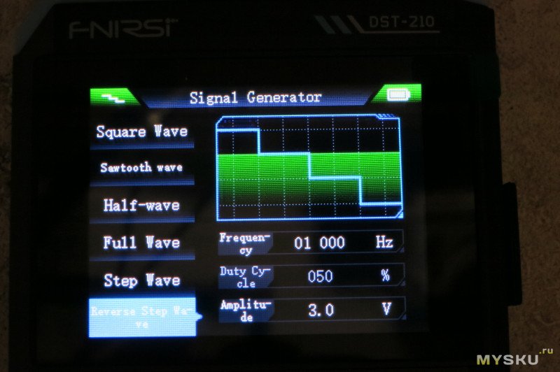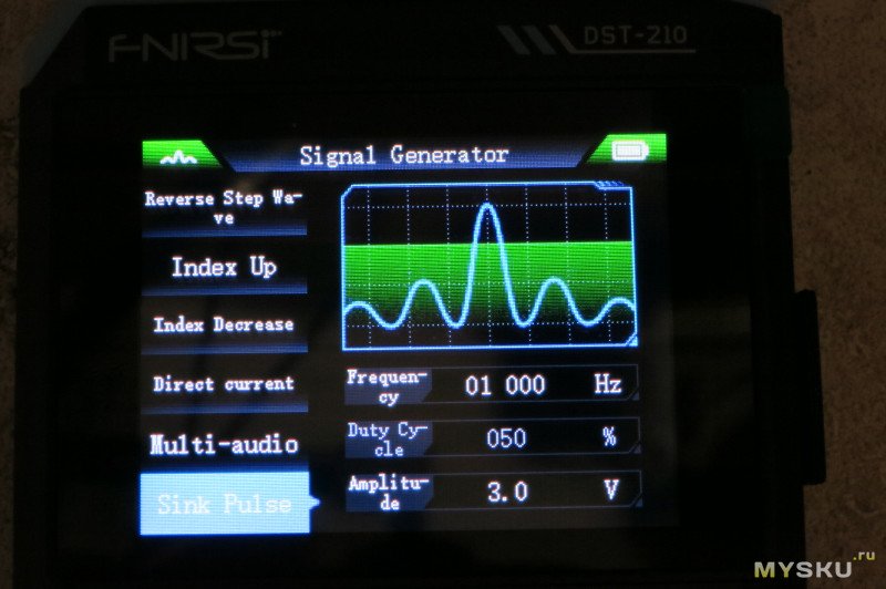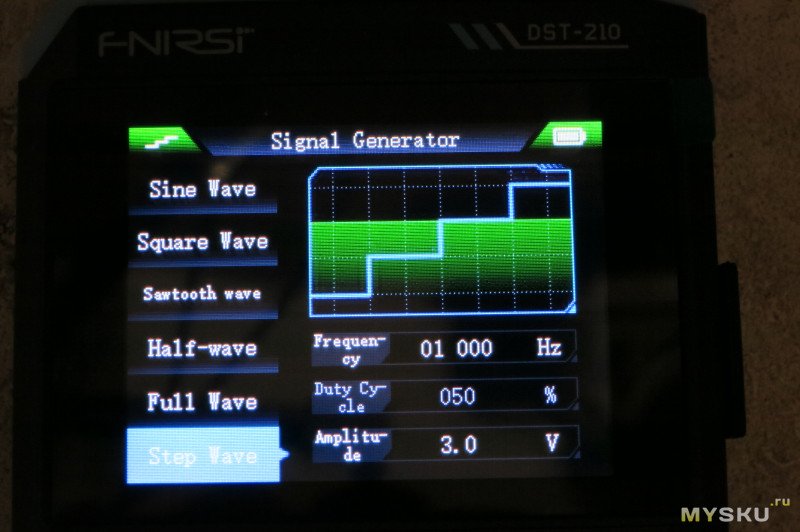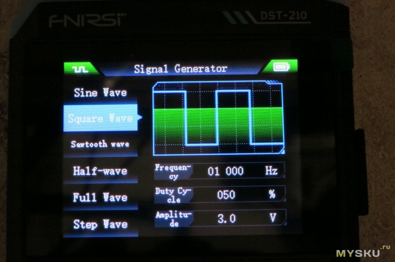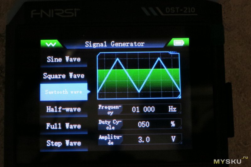 В генераторе 13 видов сигнала. Для каждого можно задать амплитуду от 0,1 до 3 вольт и частоту от 1 до 50кГц. Для некоторых сигналов можно задать скважность.