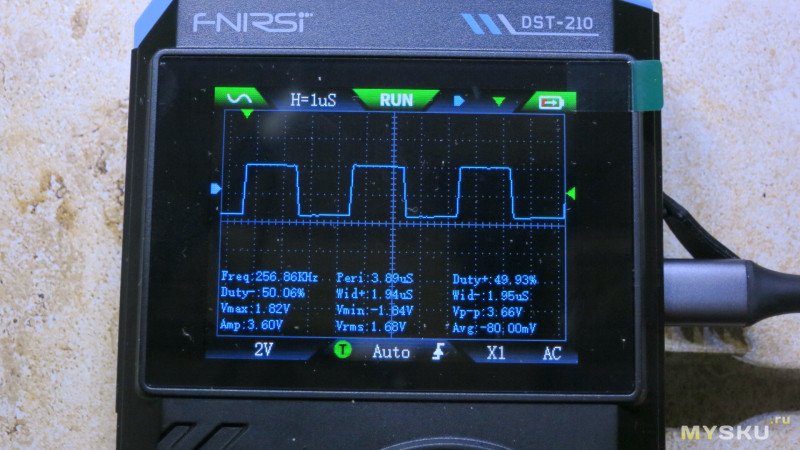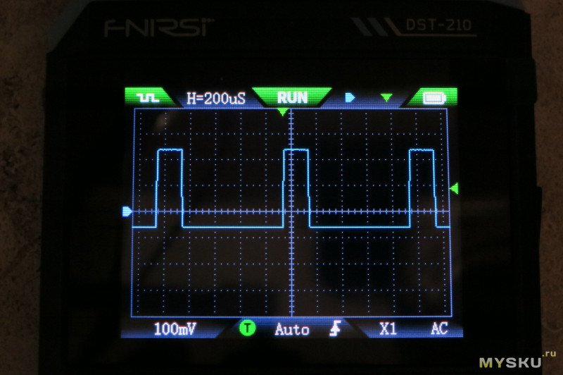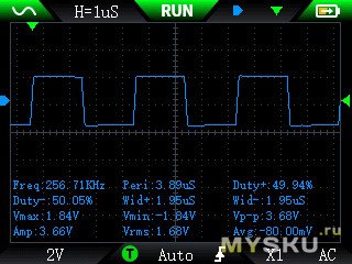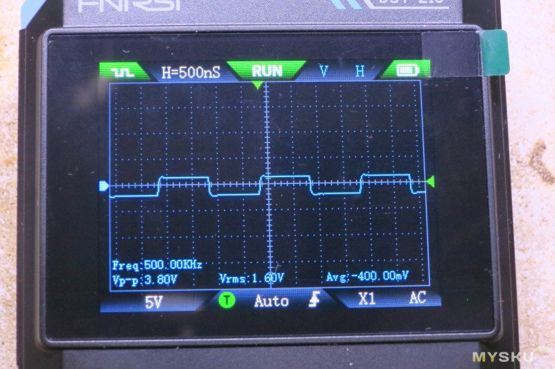 Если при этом же сигнале менять развертку времени, то можно получить такие картинки, где форма сигнала далека от искомого меандра и он показывает частоту, далекую от 500кГц.