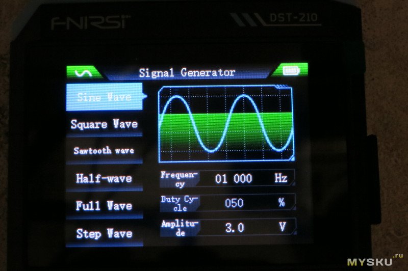 Для перехода в режим генератора из режима осциллографа можно нажать кнопку MODE. Или же можно коротко нажать боковую кнопку питания и в карусели выбрать генератор.