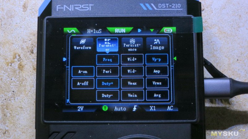 Для перехода в режим осциллографа из режима мультиметра можно нажать кнопку MODE. Или же можно коротко нажать боковую кнопку питания и в карусели выбрать осциллограф.