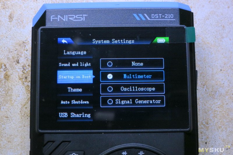 Прибор включается нажатием на кнопку на правой грани, при первом включении попросит выбрать язык — китайский или английский. Лучше выбрать английский, иначе установится китайский и придется искать где меняется язык. Но это первый пункт в меню, не страшно.Далее появляется карусель выбора режима, это мультиметр, осциллограф, генератор и настройки.