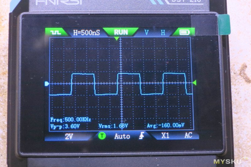 Дал сигнал 500кГц с внешнего генератора. Показывает амплитуду 3,6 вольта.
