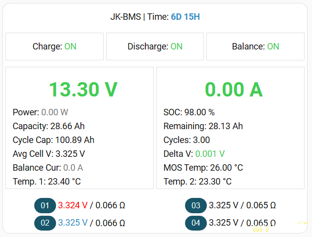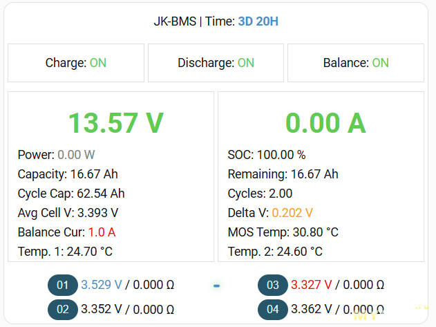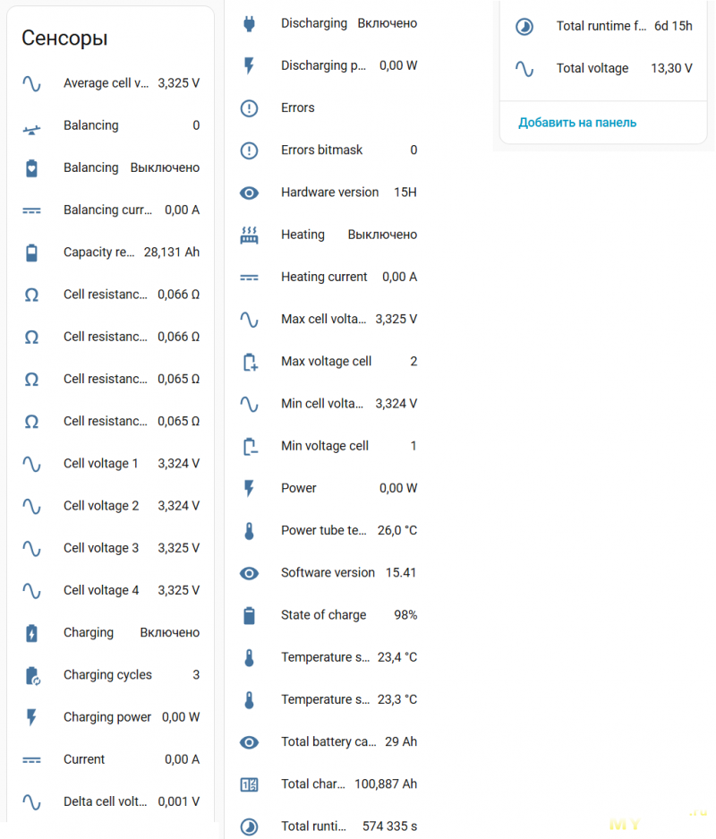 В метриках мы видим, прежде всего, напряжение на батарее в целом, на каждой ячейке в отдельности, ёмкость батареи (после каждого цикла заряда-разряда обновляется на актуальную), остаток заряда, мощность в Ah и W получаемой/отдаваемой энергии, температуру на мосфетах и датчиках.